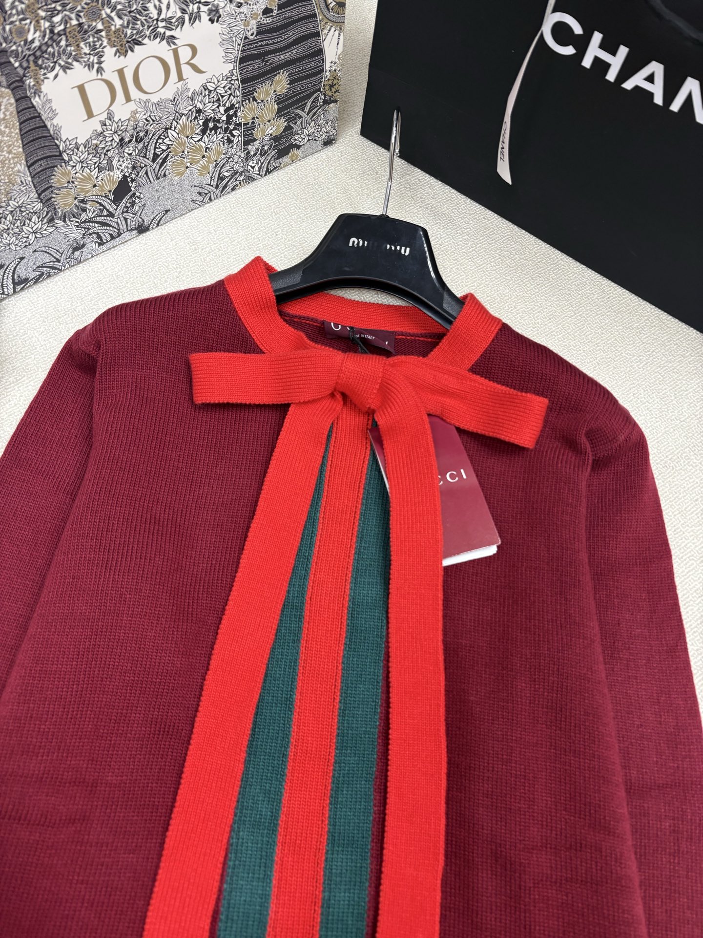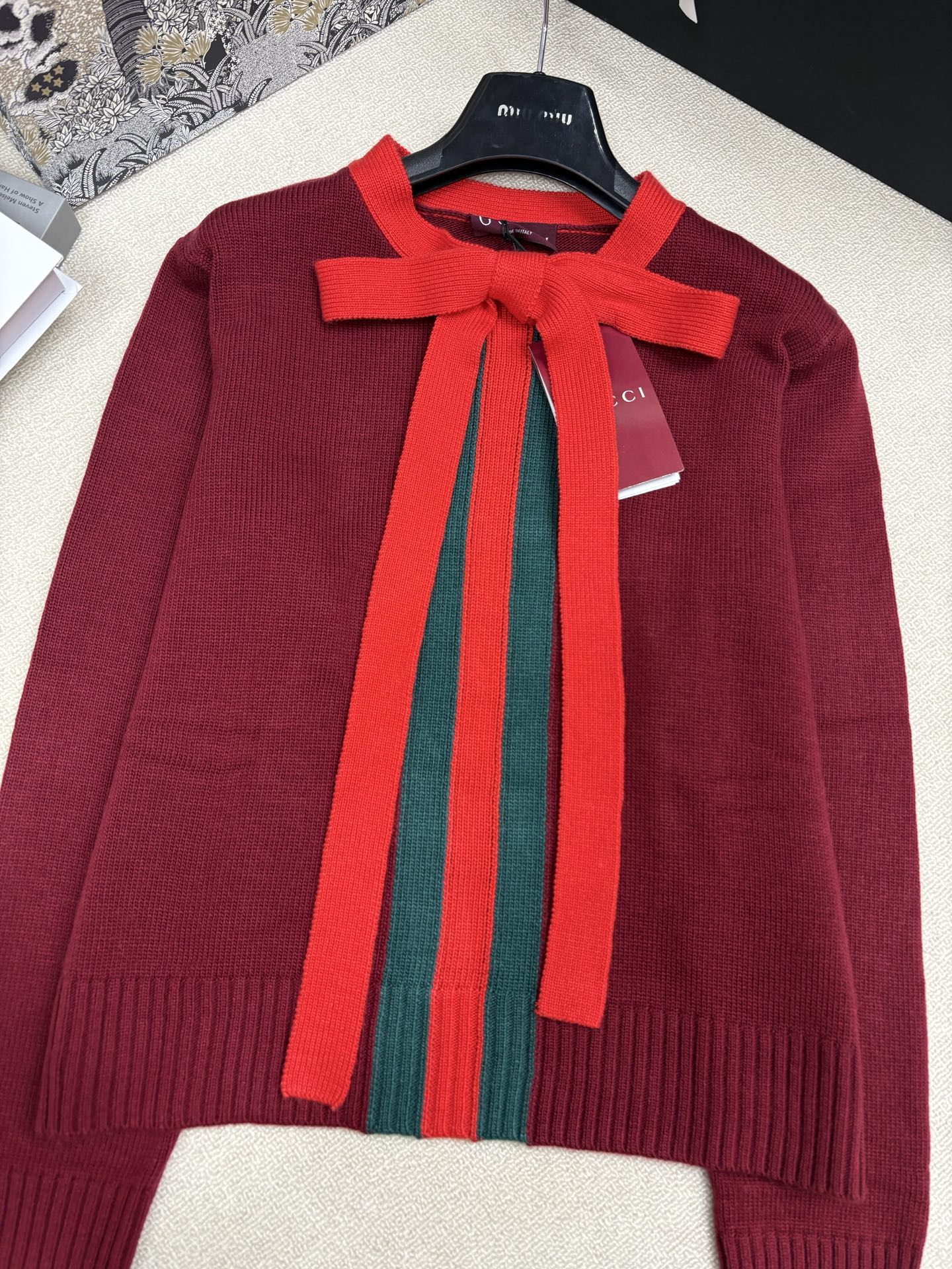 Details: Early Spring New Knitted Round-Neck Pullover, Classic Three-Color Stripe Jacquard, Bow Tie Decoration, SML Sizes