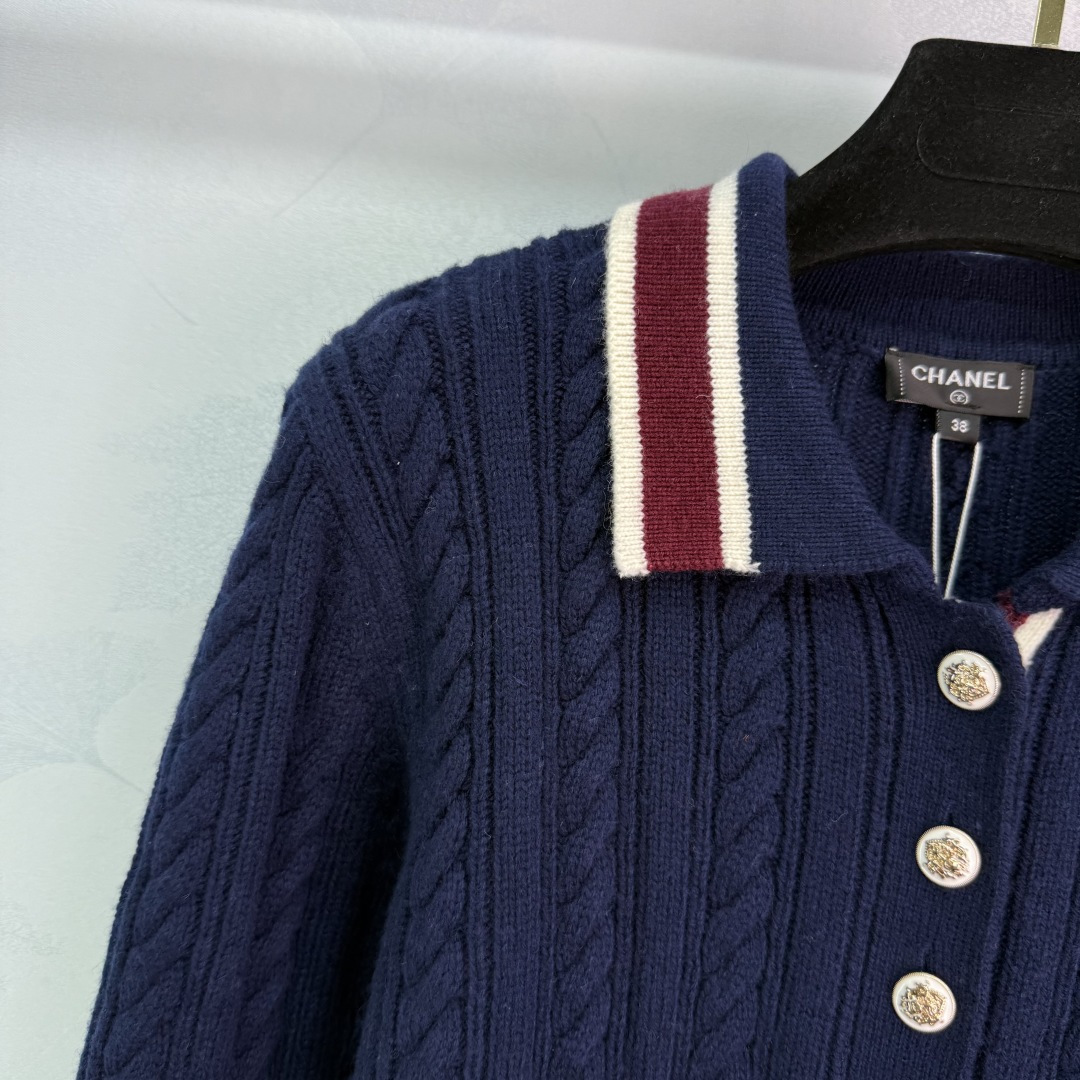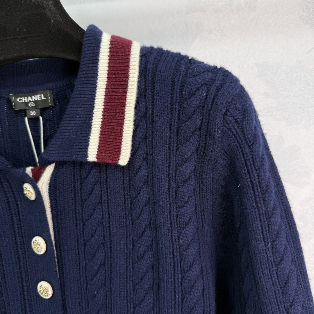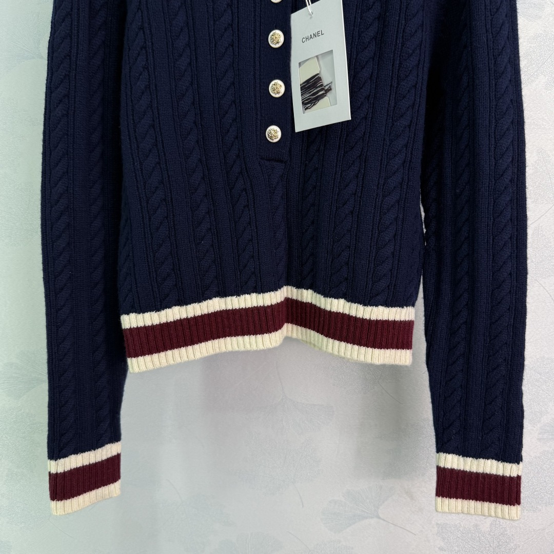 Details: Autumn knitted top and skirt set with striped buttons, showing a schoolgirl style.