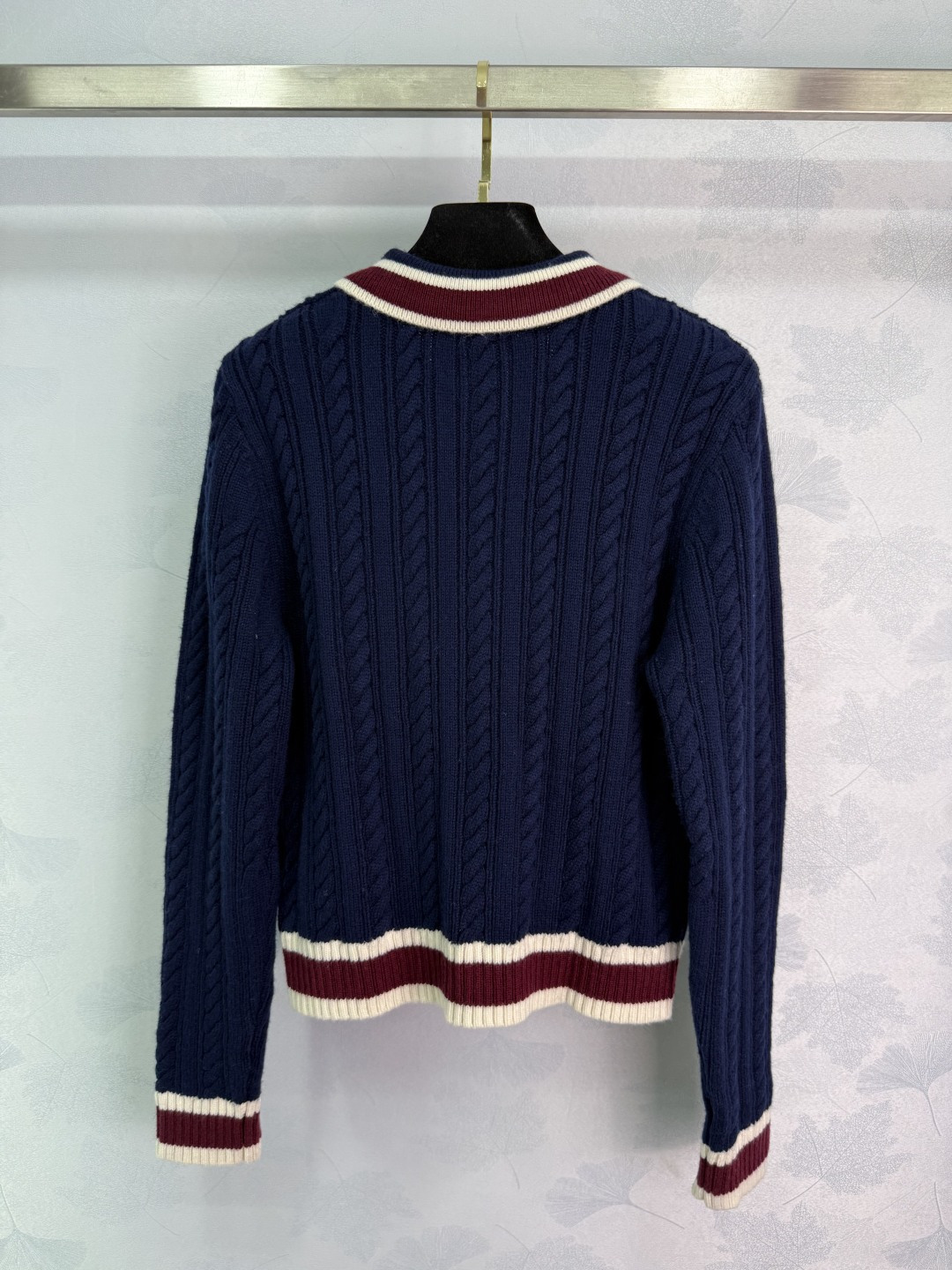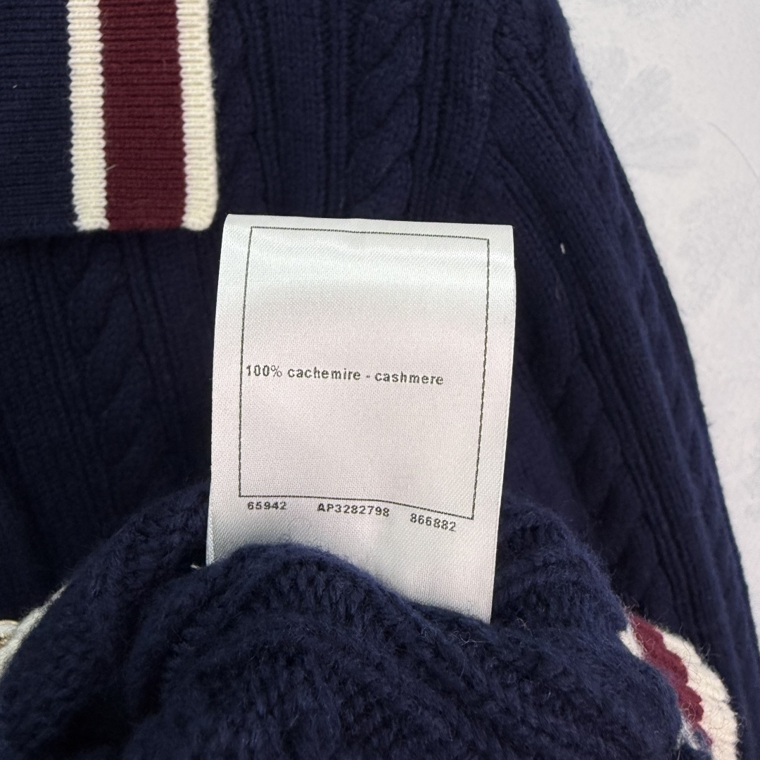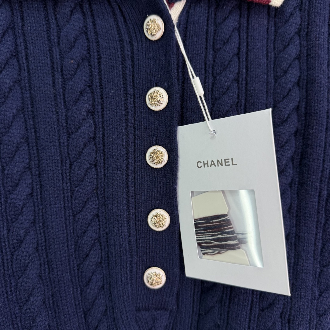 Details: Autumn knitted top and skirt set with striped buttons, showing a schoolgirl style.