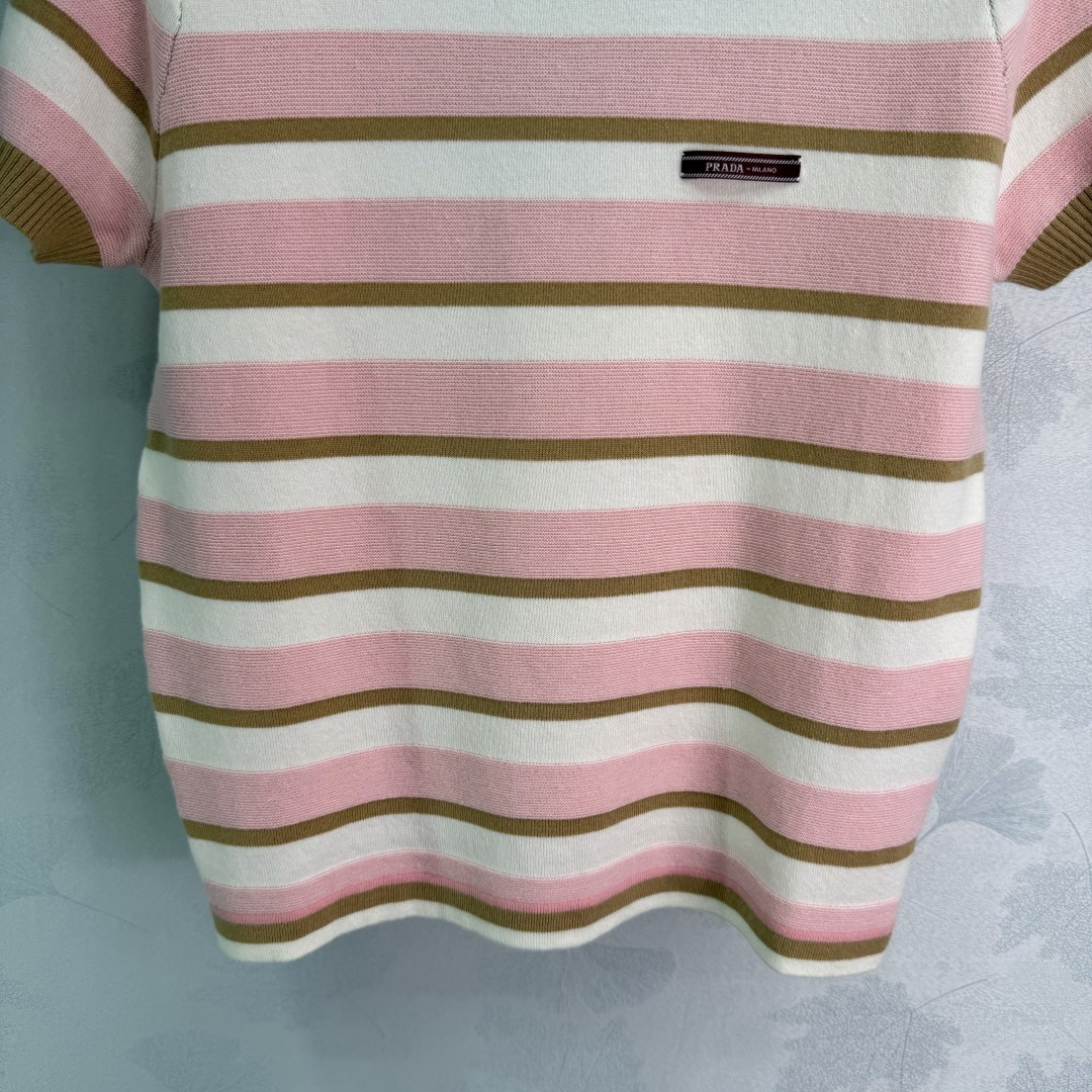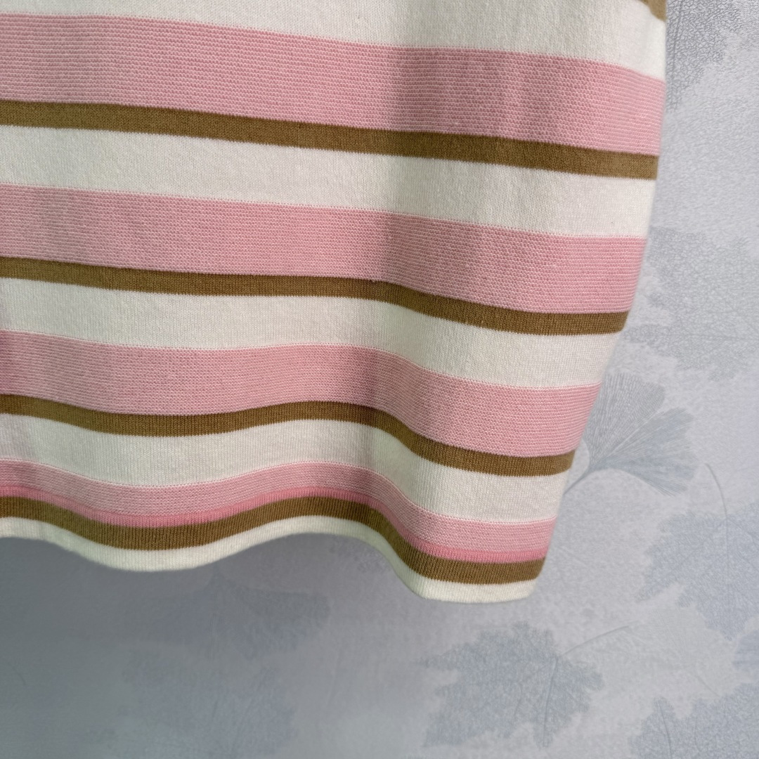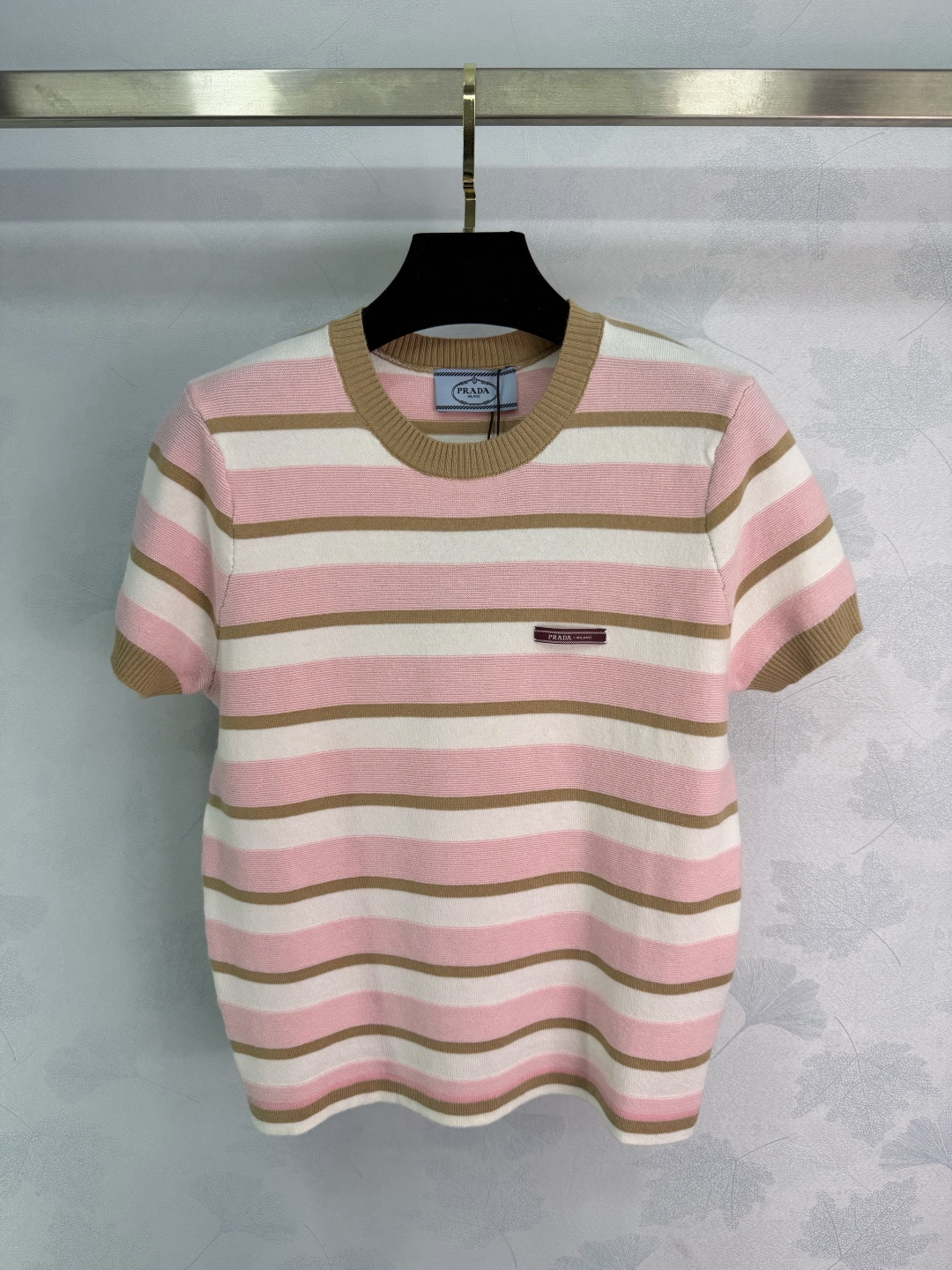 Details: Spring-summer striped knit short-sleeved top, pink-white-brown horizontal stripes, soft and elastic, round neck, suitable for daily commute or casual wear.