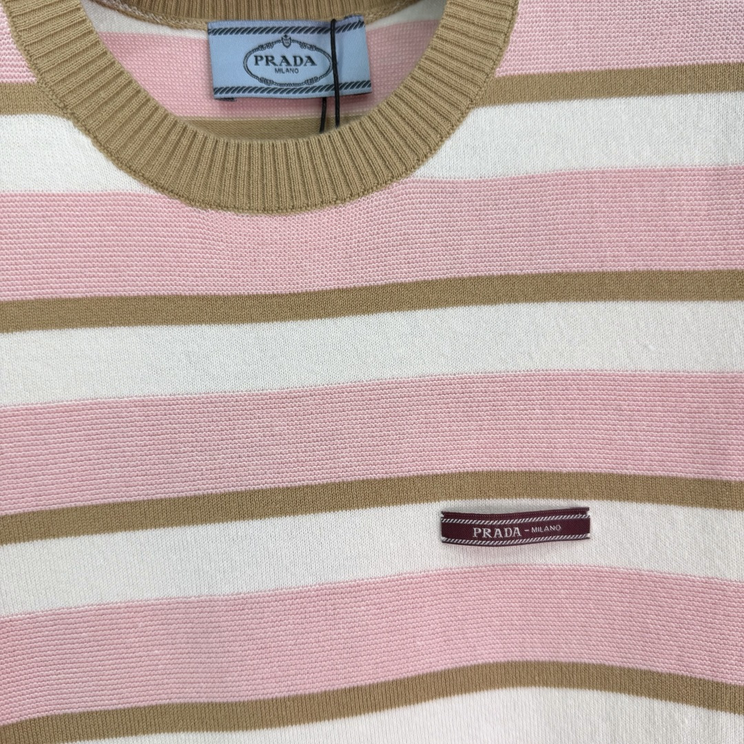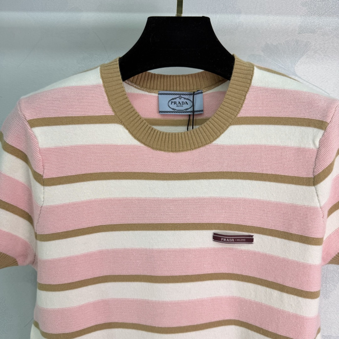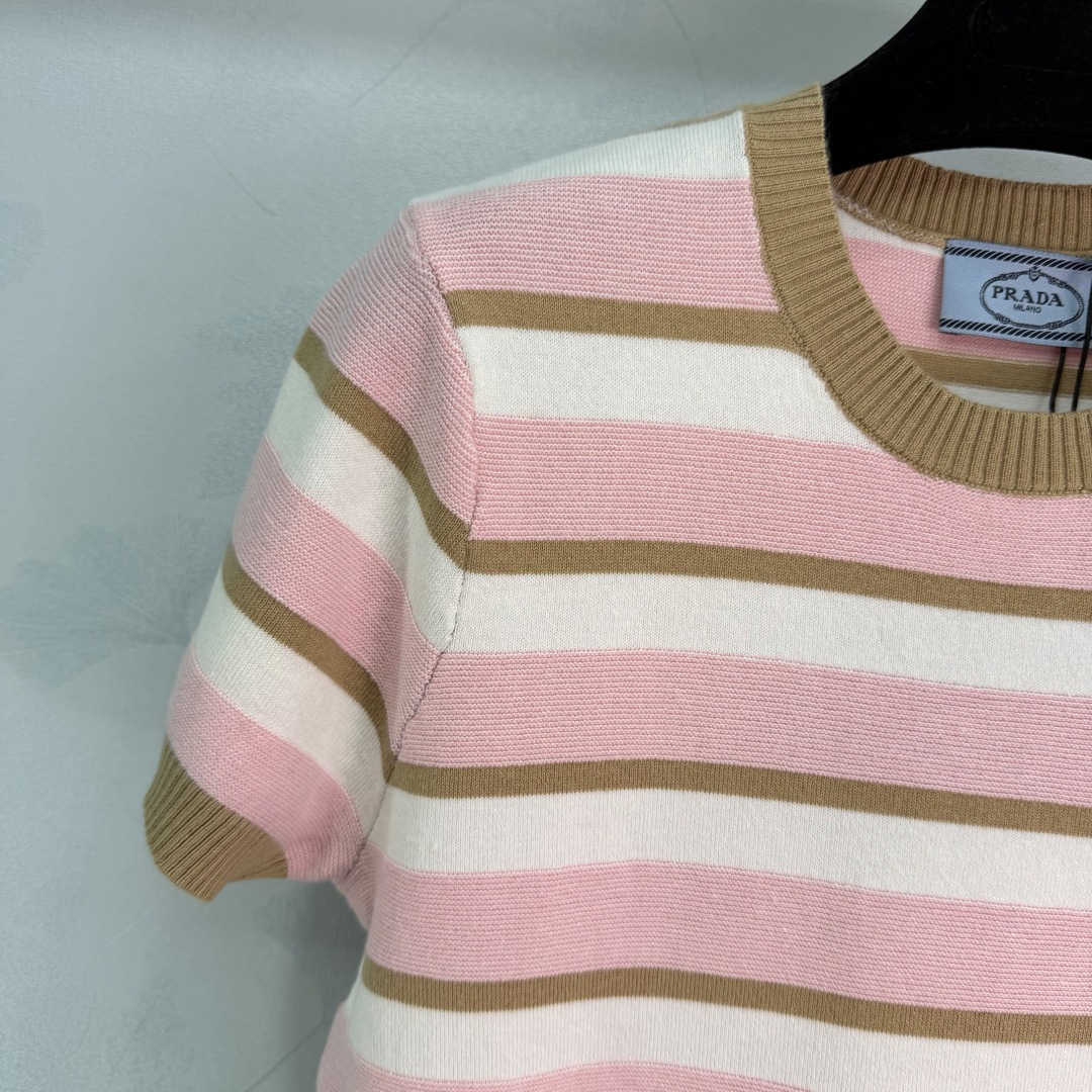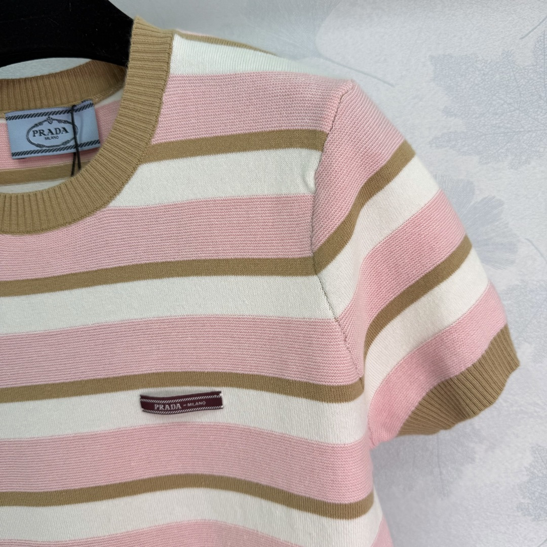Details: Spring-summer striped knit short-sleeved top, pink-white-brown horizontal stripes, soft and elastic, round neck, suitable for daily commute or casual wear.