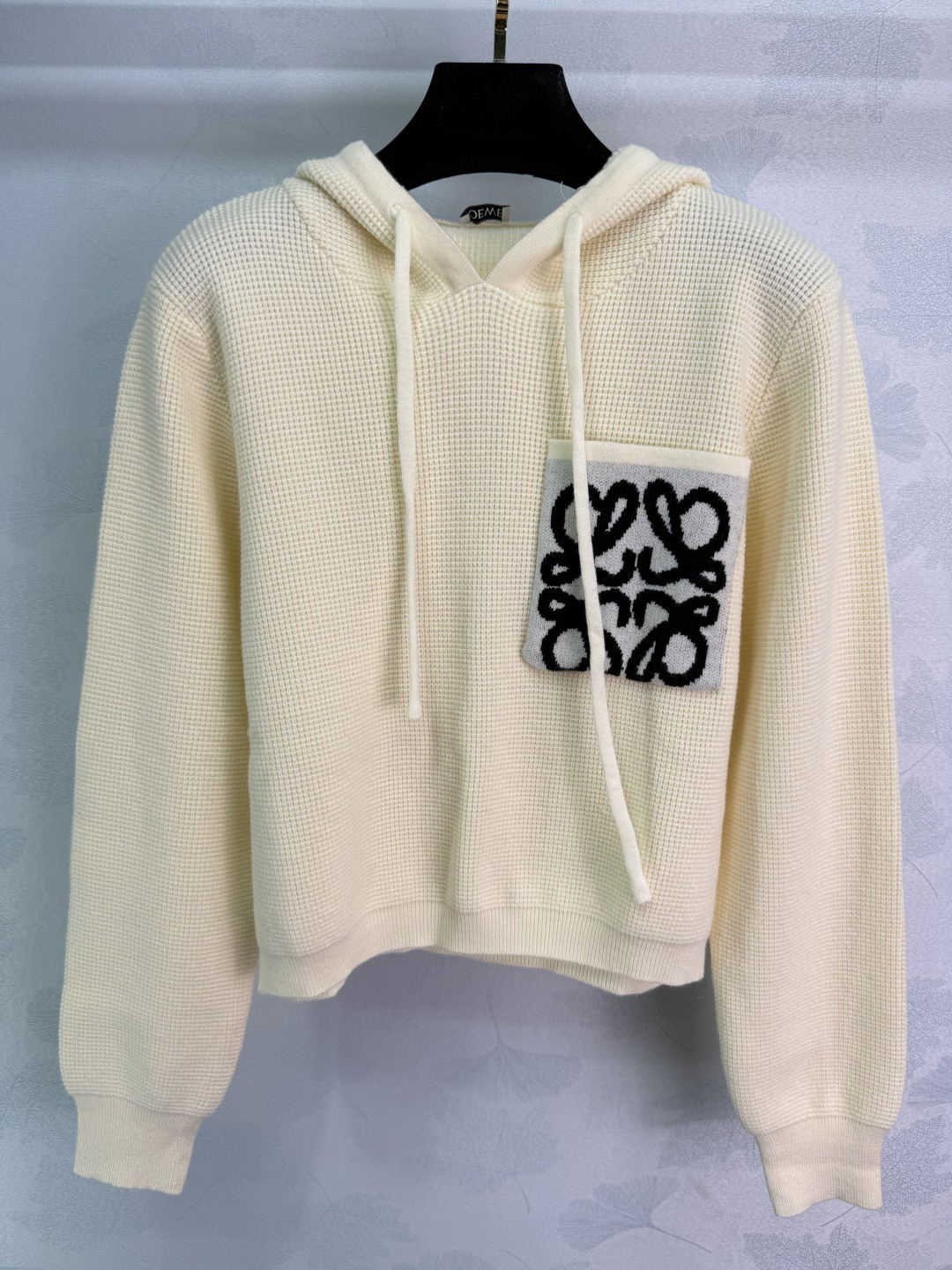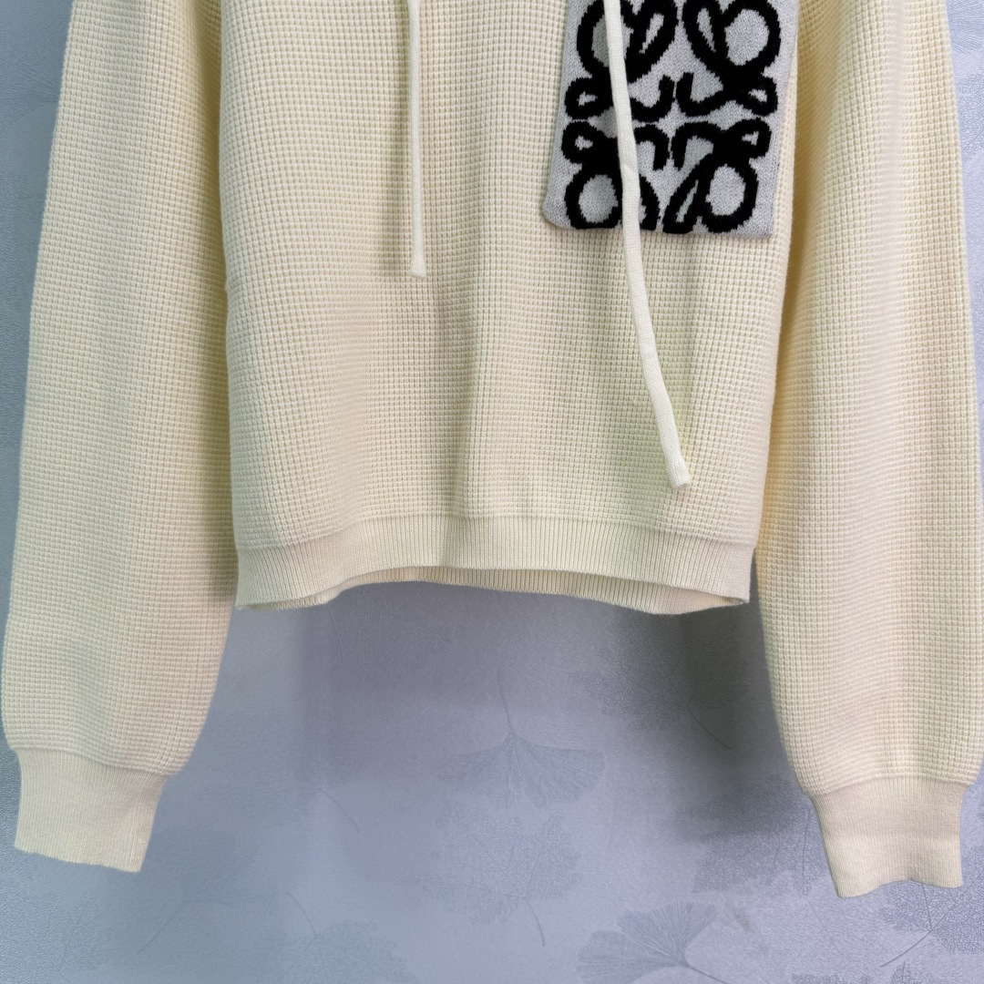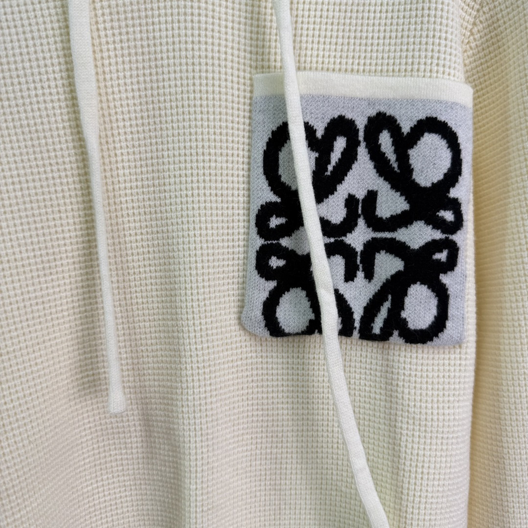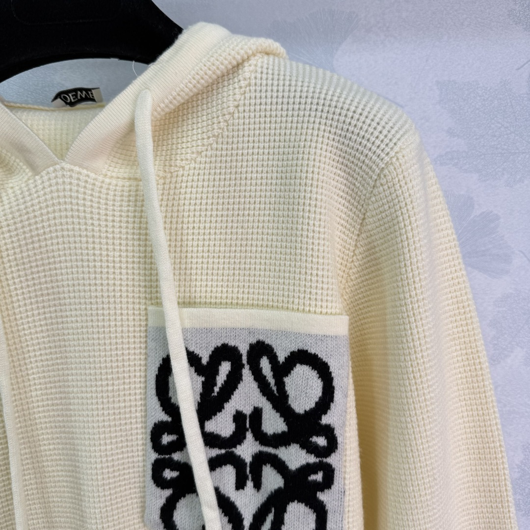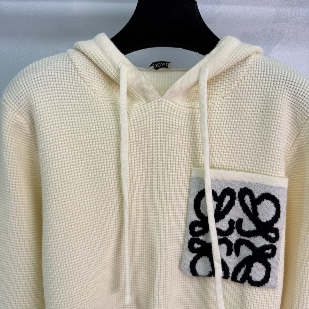 Details: early autumn hooded knit pullover, made of custom wool yarn, featuring high-quality texture, cozy and warm, with a classic pocket logo for a timeless style.