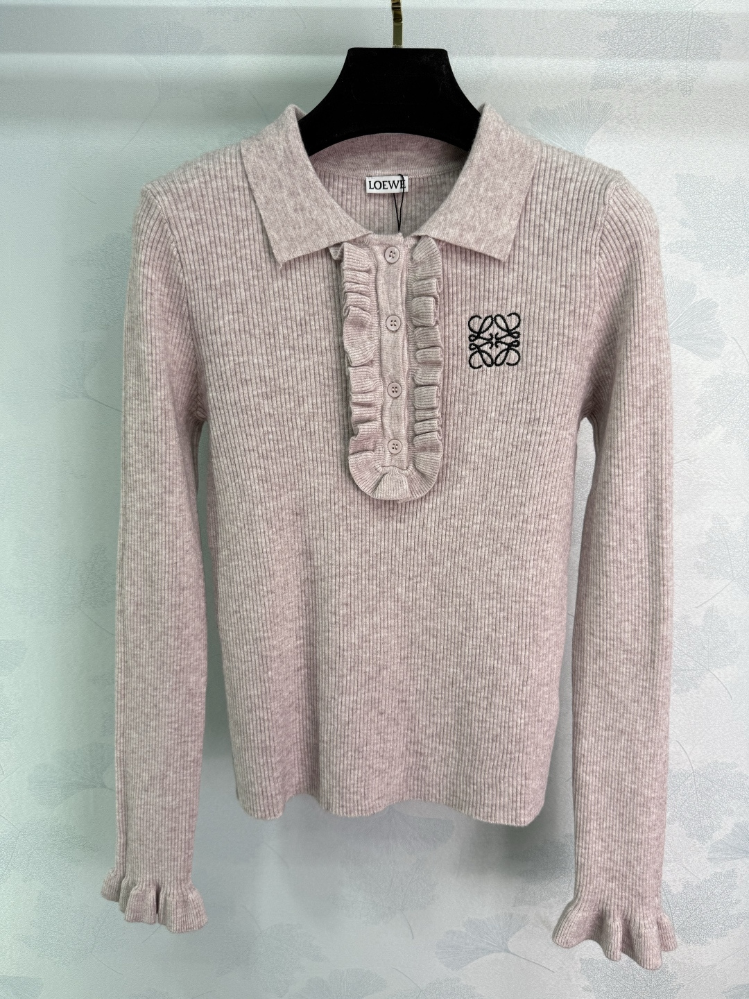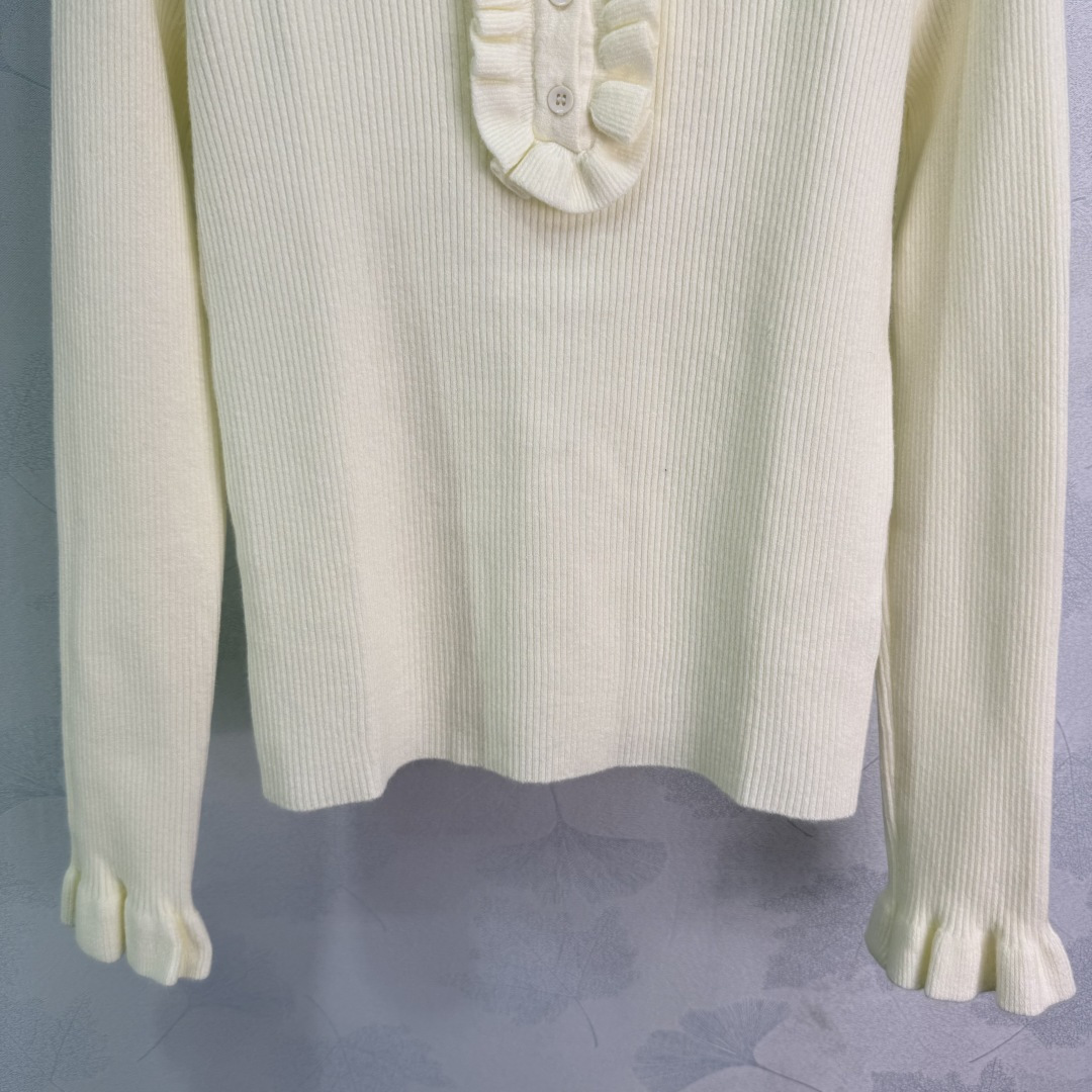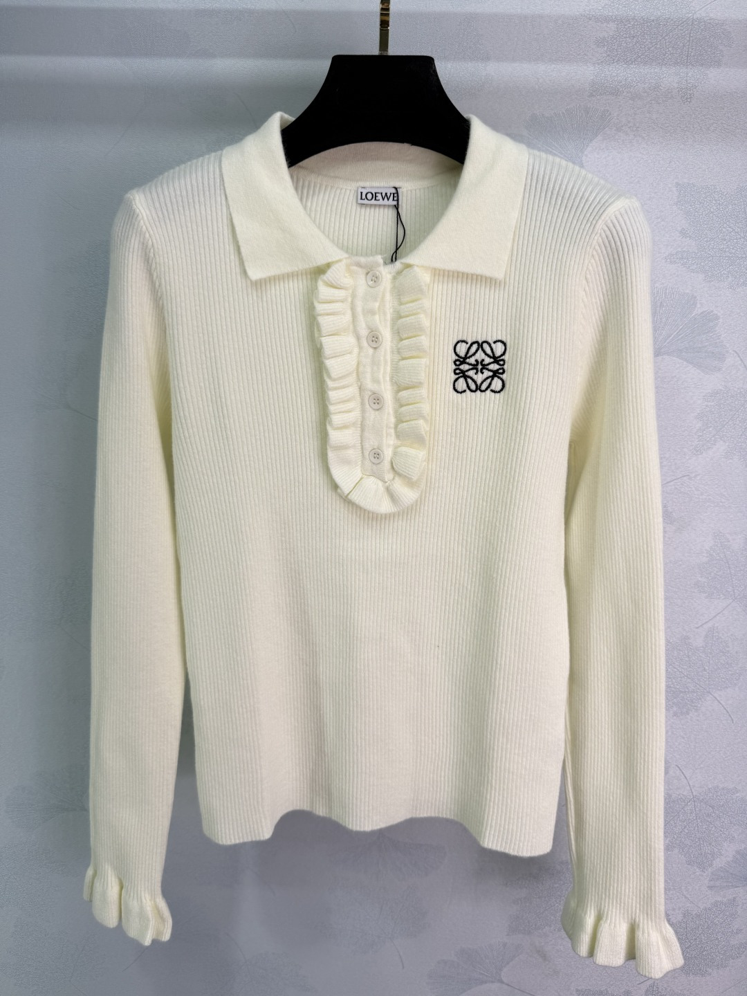 Details: Autumn s new collar knitwear with classic logo embroidery and ruffled design, showcasing elegance and comfort with high-quality wool blend.