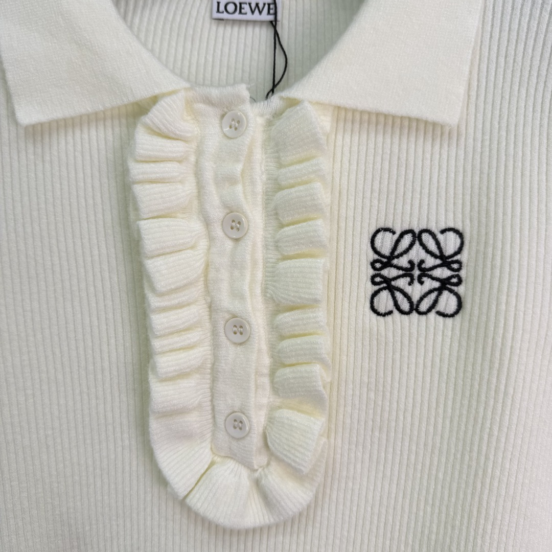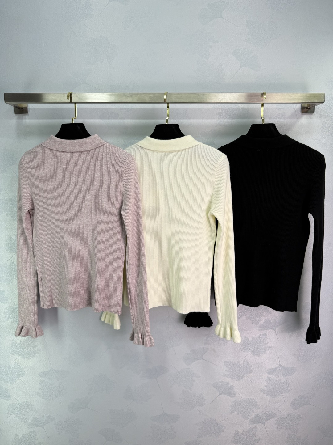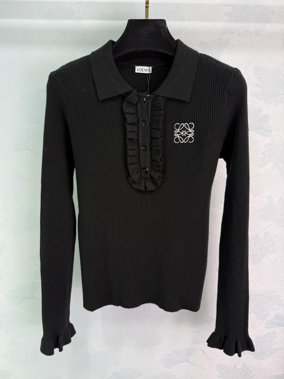 Details: Autumn s new collar knitwear with classic logo embroidery and ruffled design, showcasing elegance and comfort with high-quality wool blend.