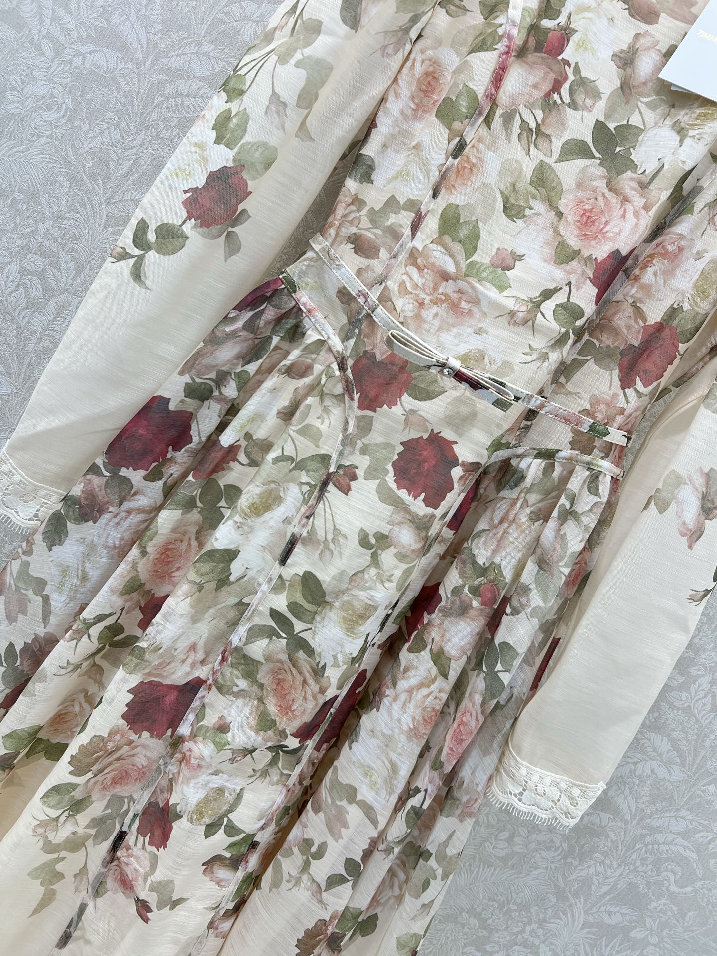 Details: Long Rose-print Dress with Large Ruffled Skirt and Bow Belt, Elegant and Noble, High-end Custom, Fine Workmanship