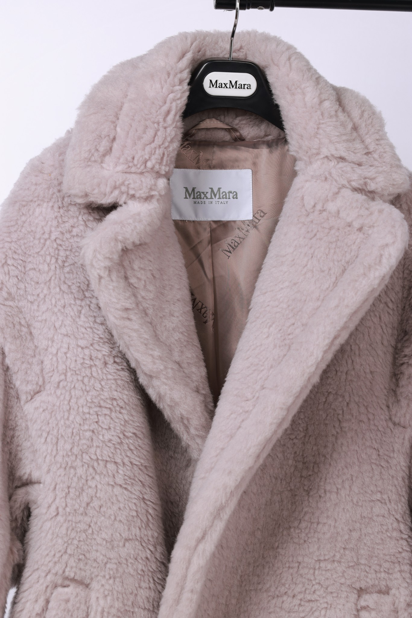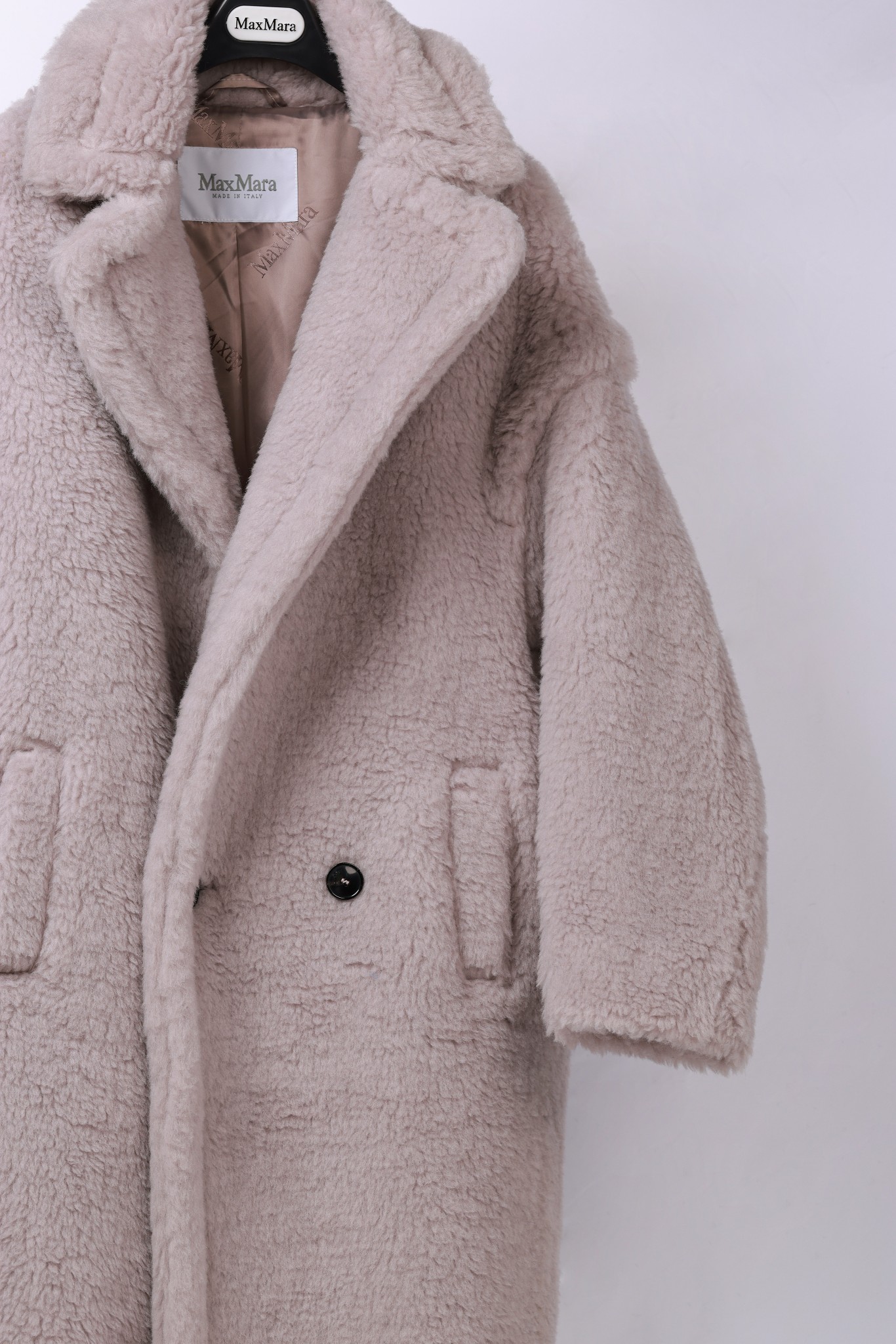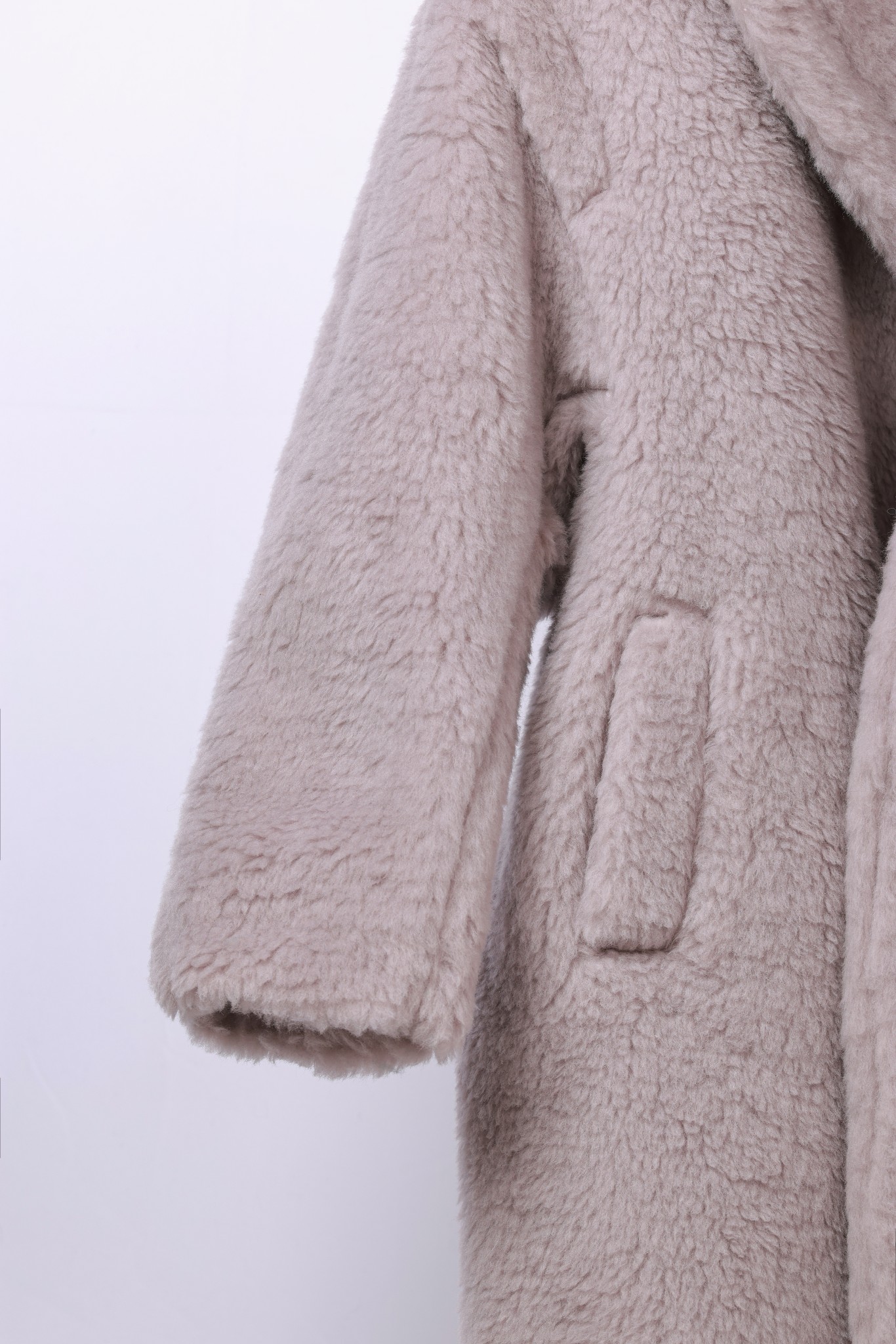 Details: Long teddy bear style, sizes XS & M, sand beige. 62% alpaca, 26% wool, 12% silk. High-end custom, fine workmanship