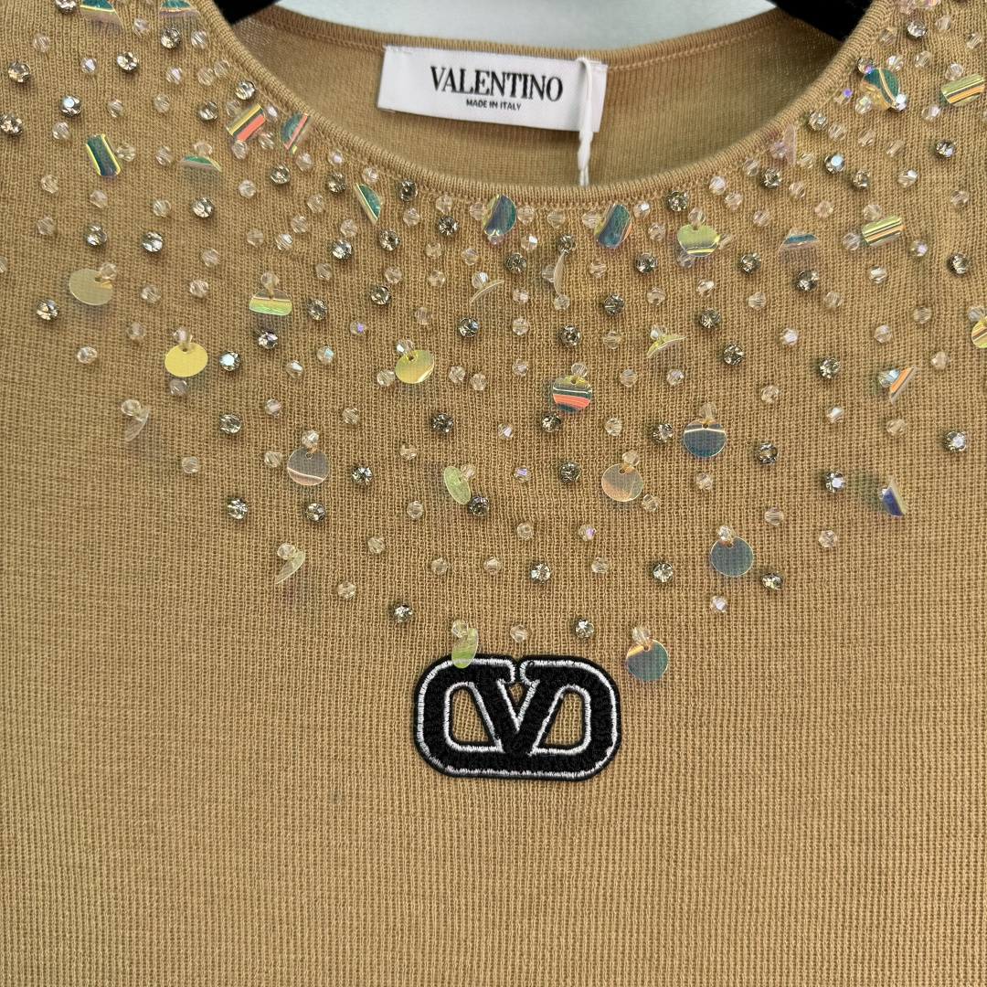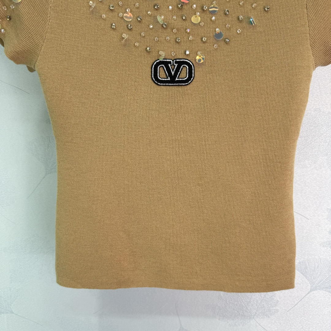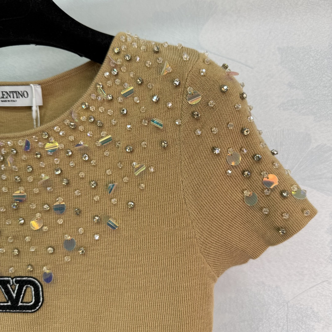 Details: Autumn s new heavily beaded short-sleeved knitwear with sparkling diamond designs on the chest and shoulders, exuding elegance and artistry.