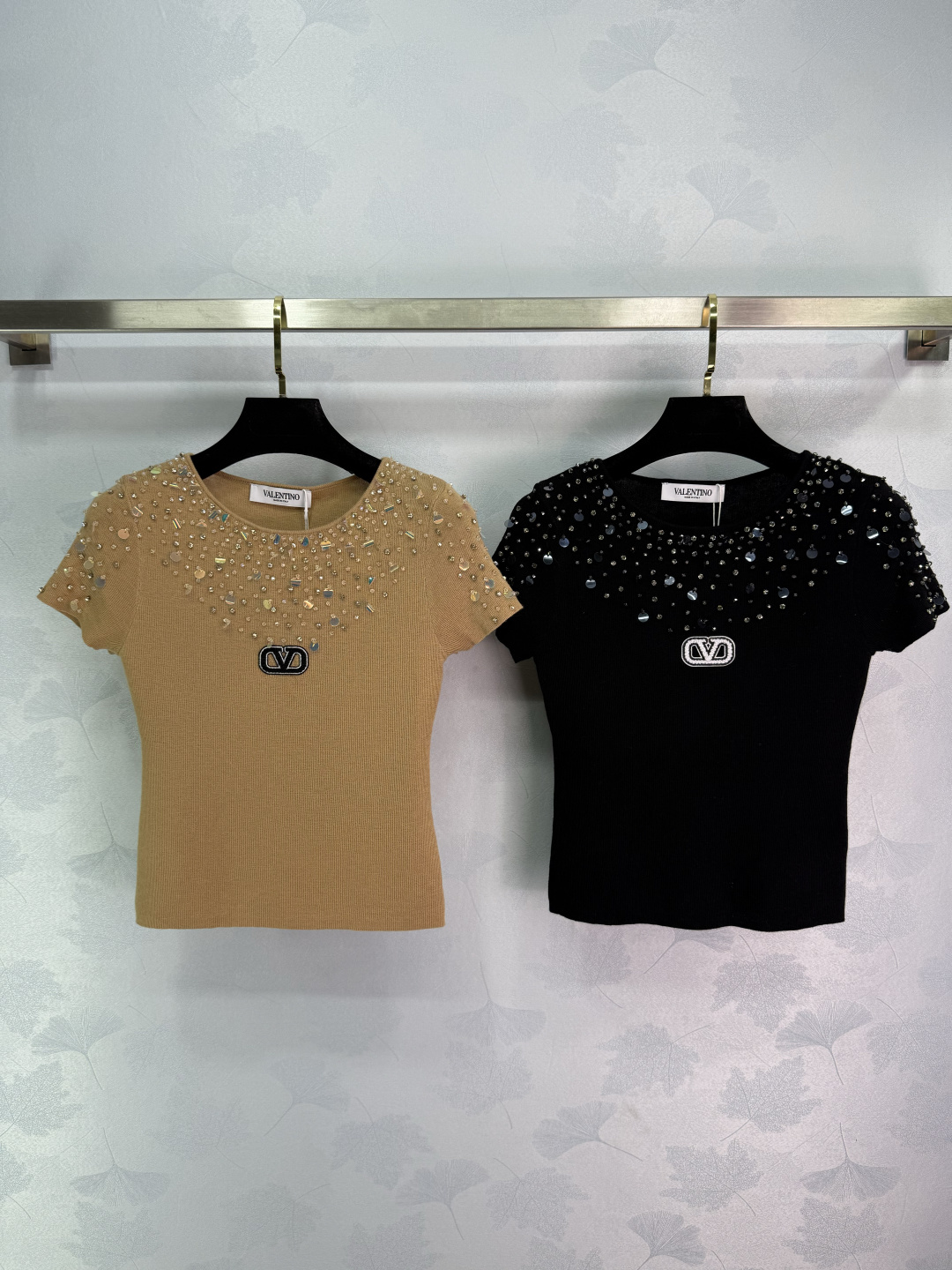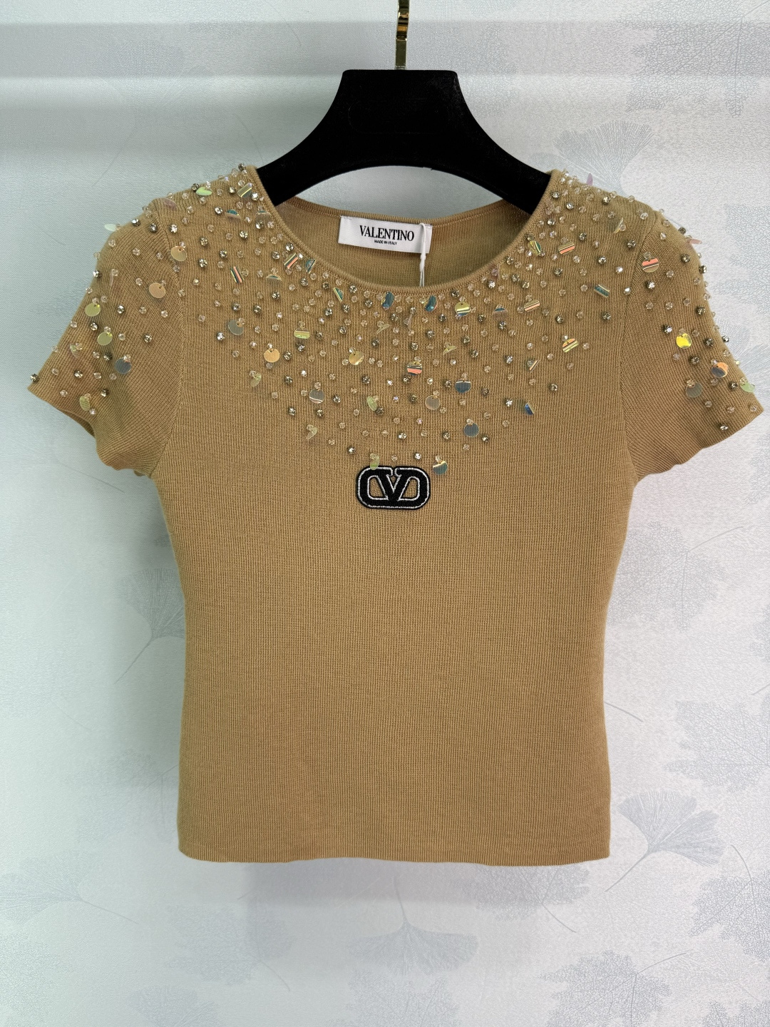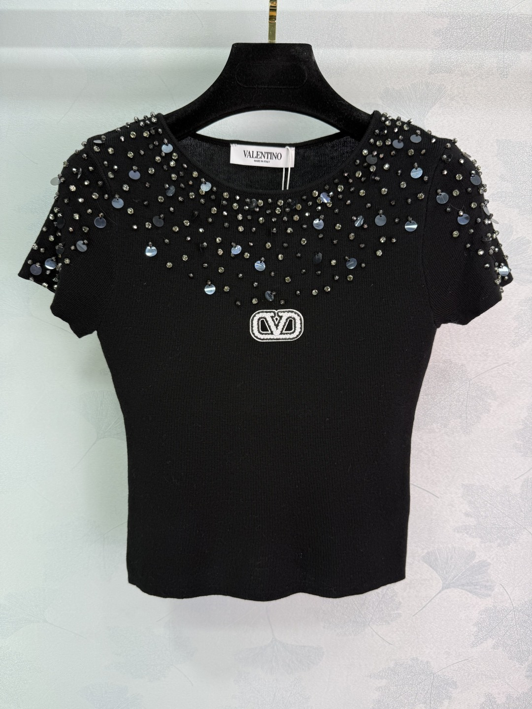 Details: Autumn s new heavily beaded short-sleeved knitwear with sparkling diamond designs on the chest and shoulders, exuding elegance and artistry.