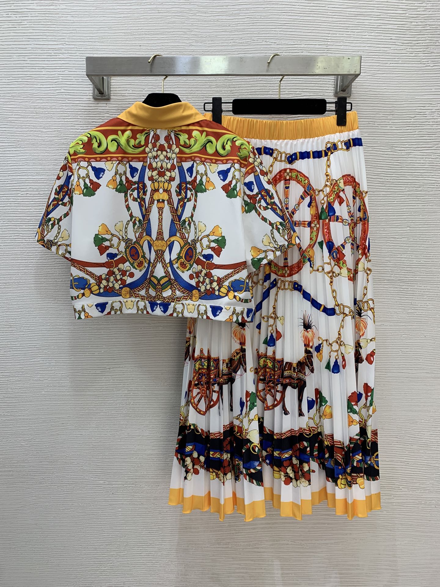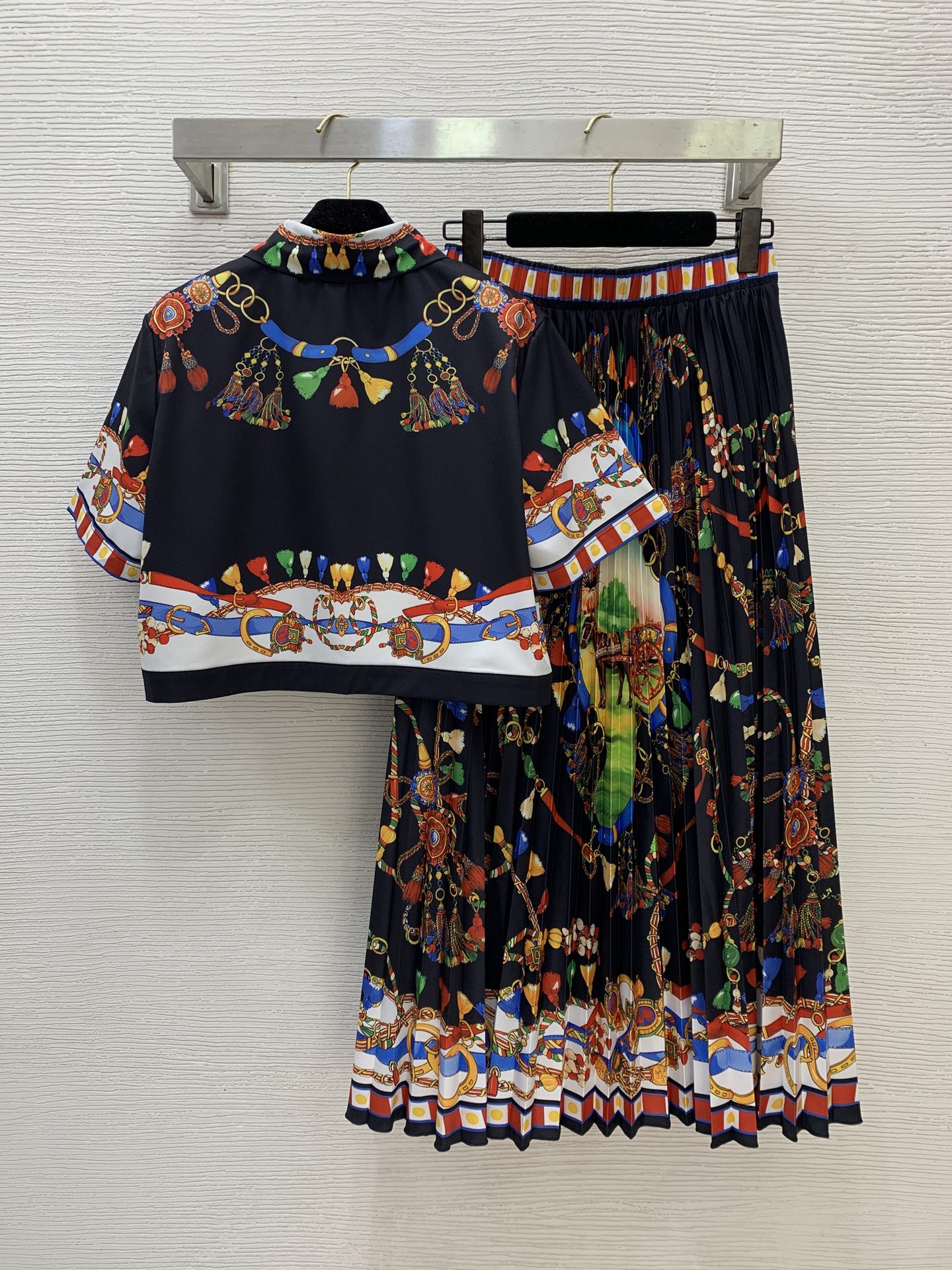 Details: New vintage print two-piece suit consisting of a short shirt and a long pleated skirt, available in white and black, size L