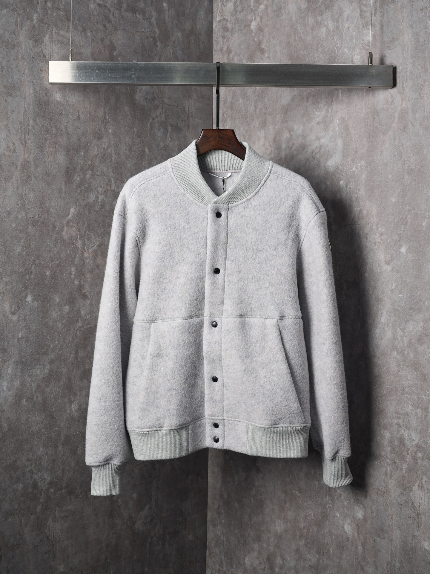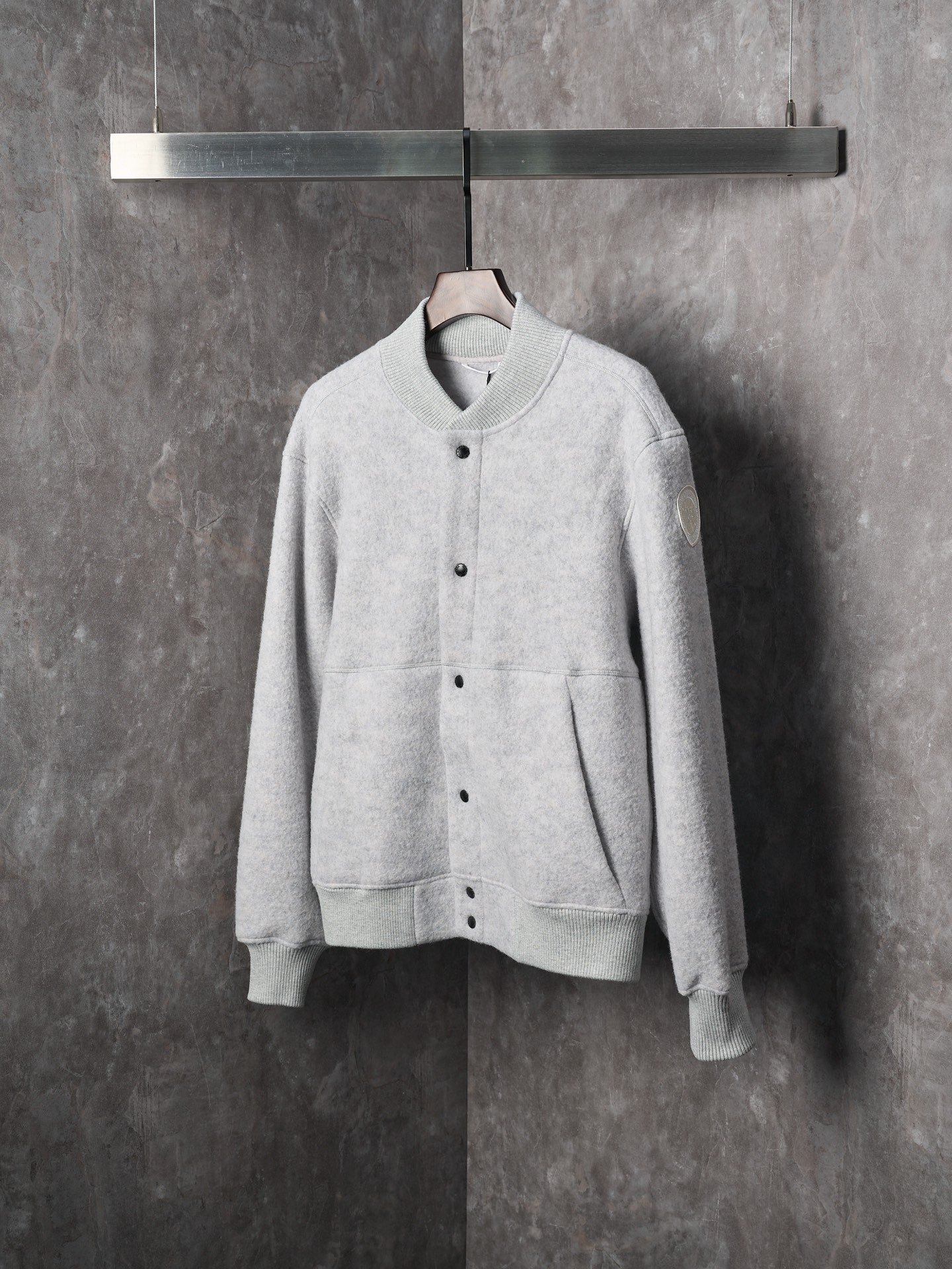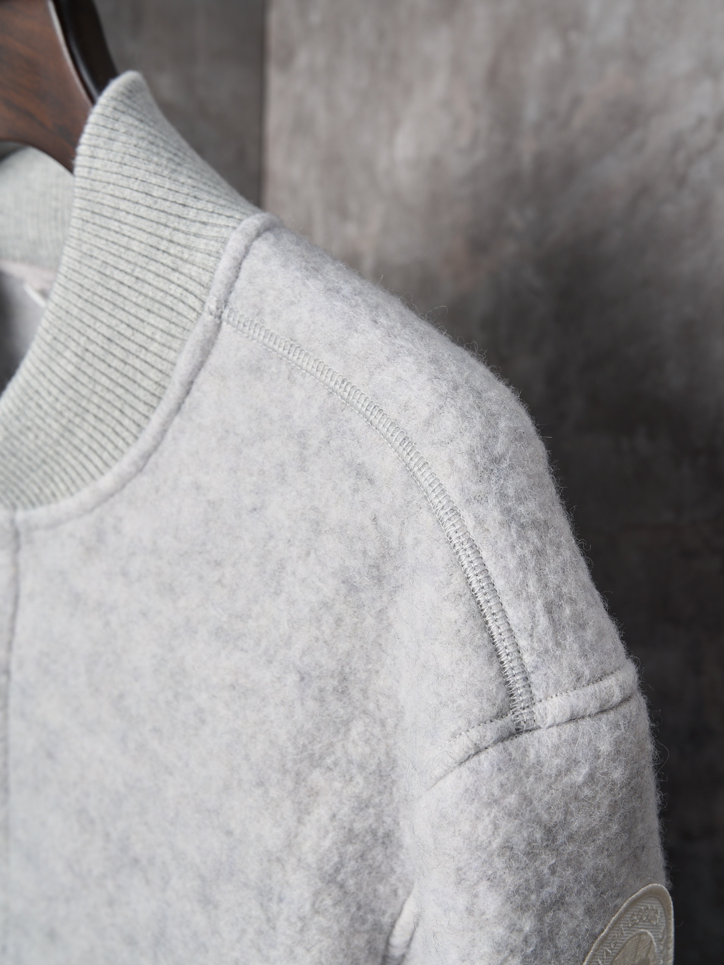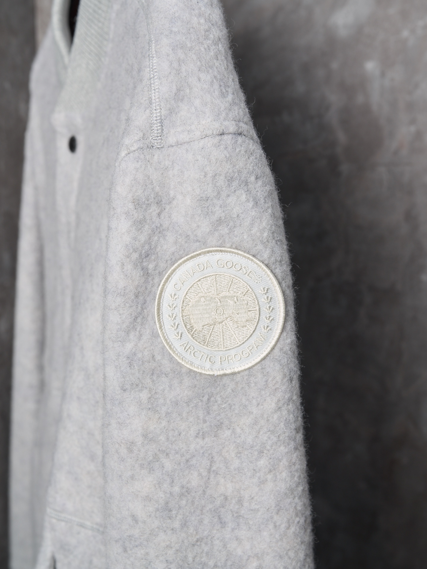 Details: Real-object photo of a durable and practical fleece-patched button-up wool blend jacket in dark and light gray, with a ribbed collar, cuffs, and hem, and a white circular patch on the left arm.