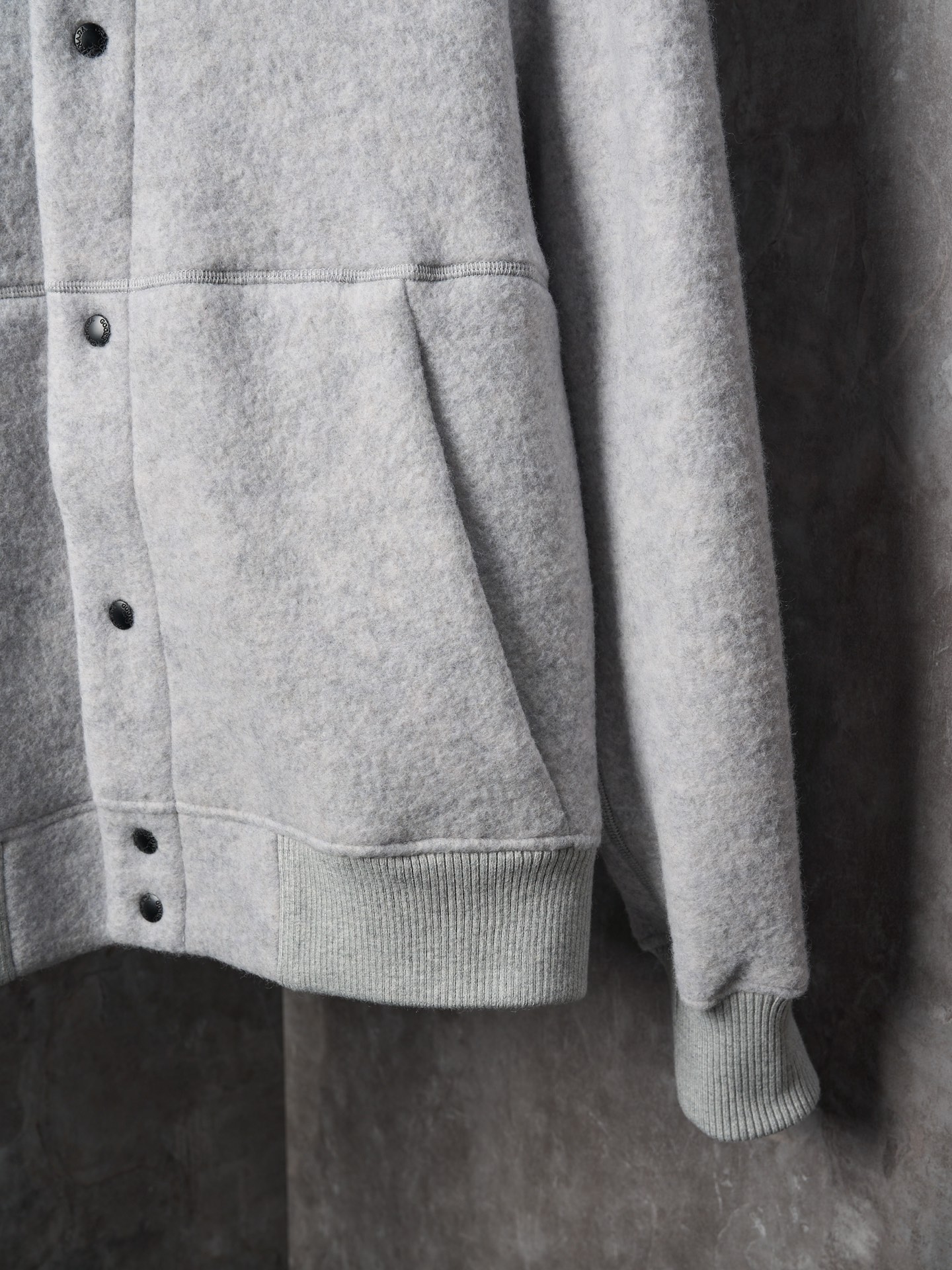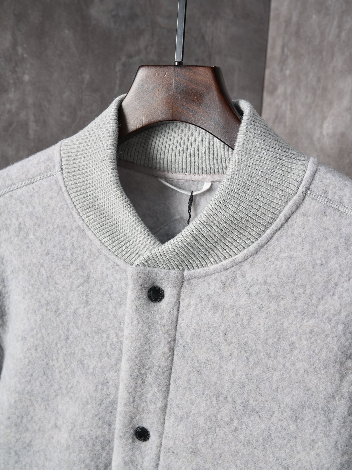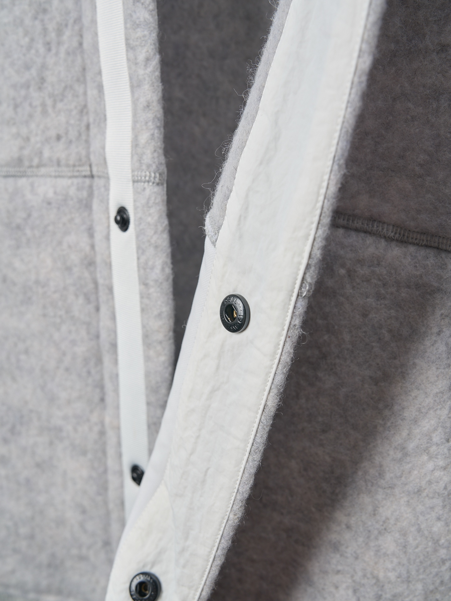 Details: Real-object photo of a durable and practical fleece-patched button-up wool blend jacket in dark and light gray, with a ribbed collar, cuffs, and hem, and a white circular patch on the left arm.