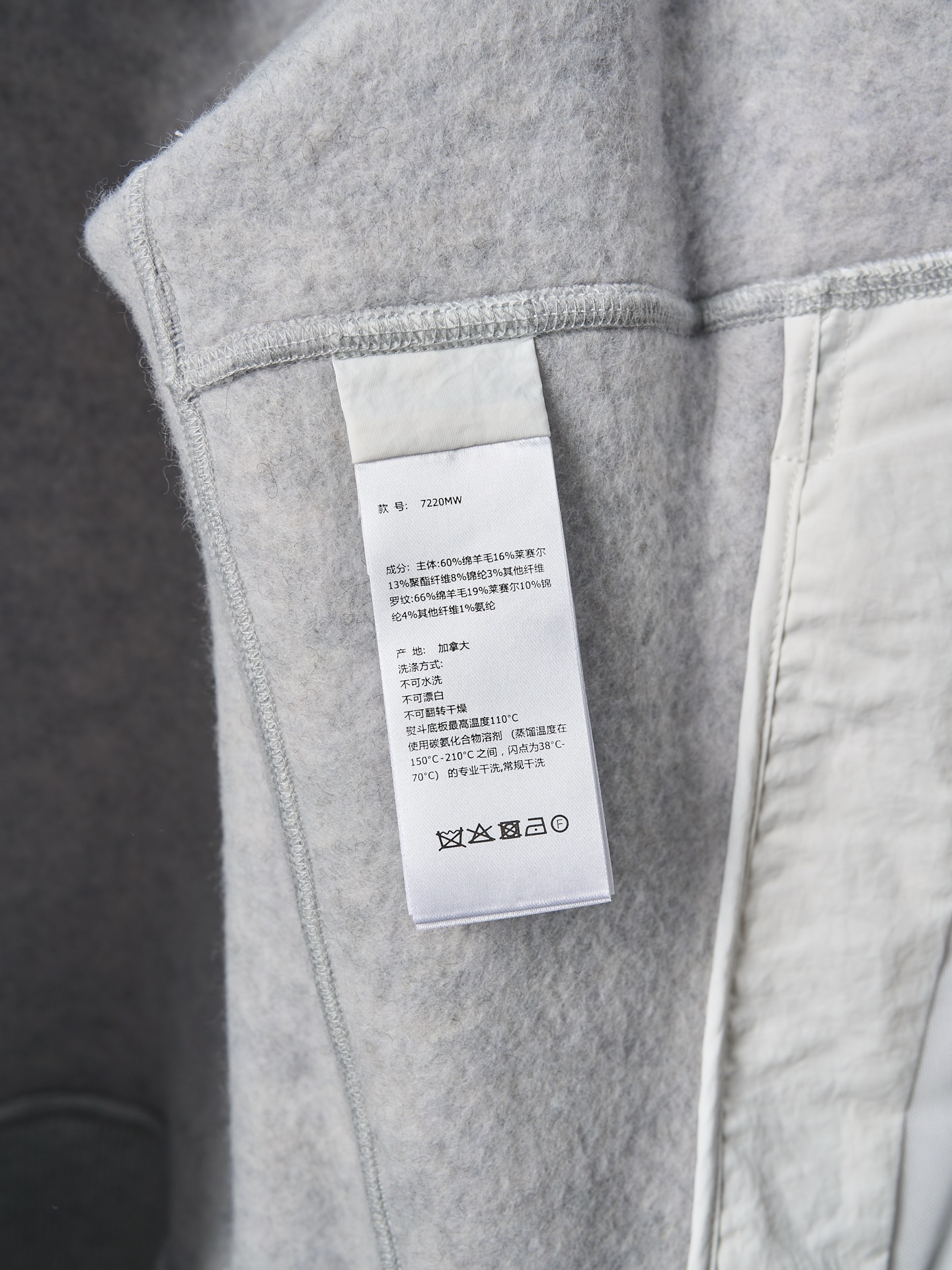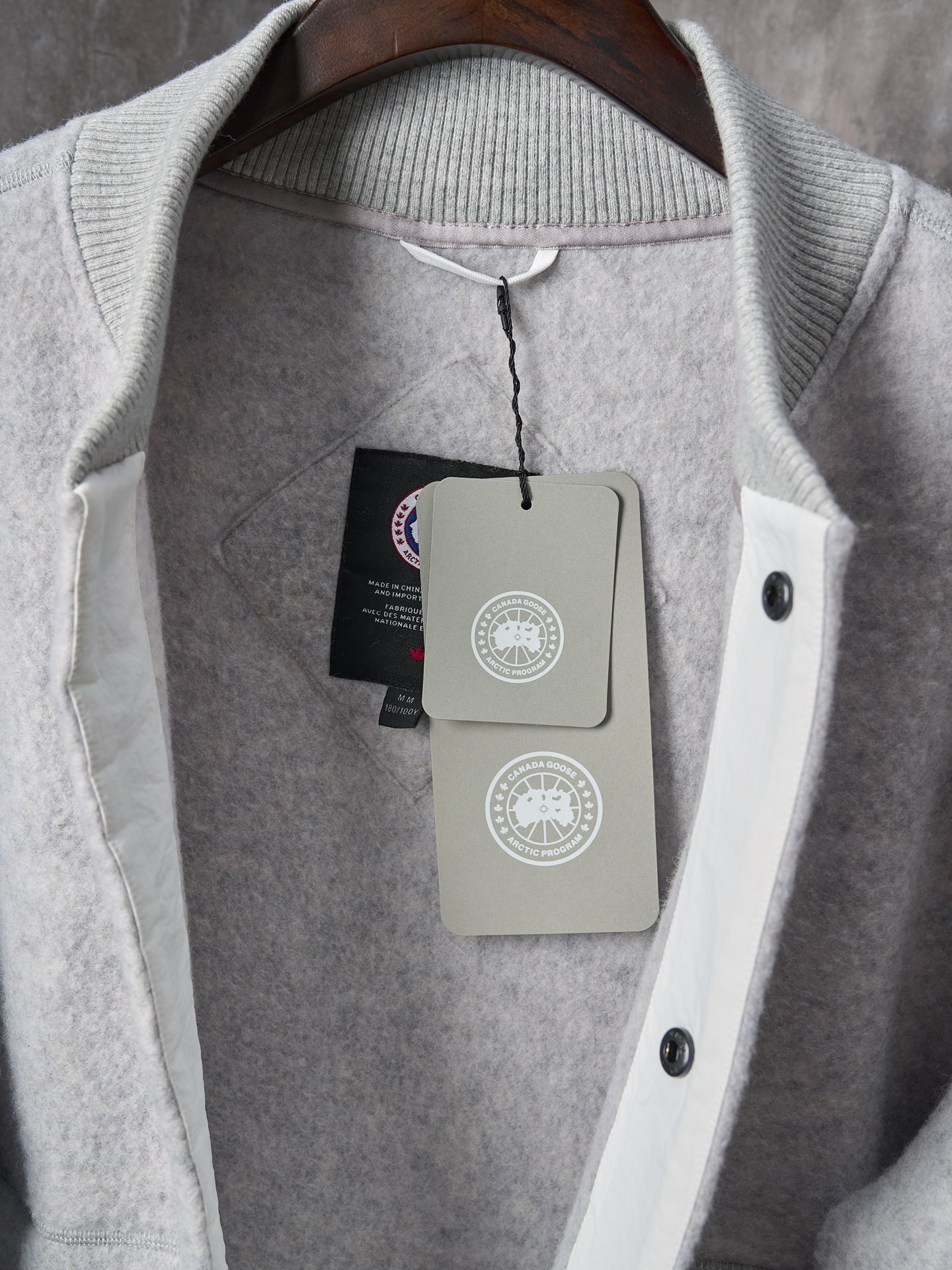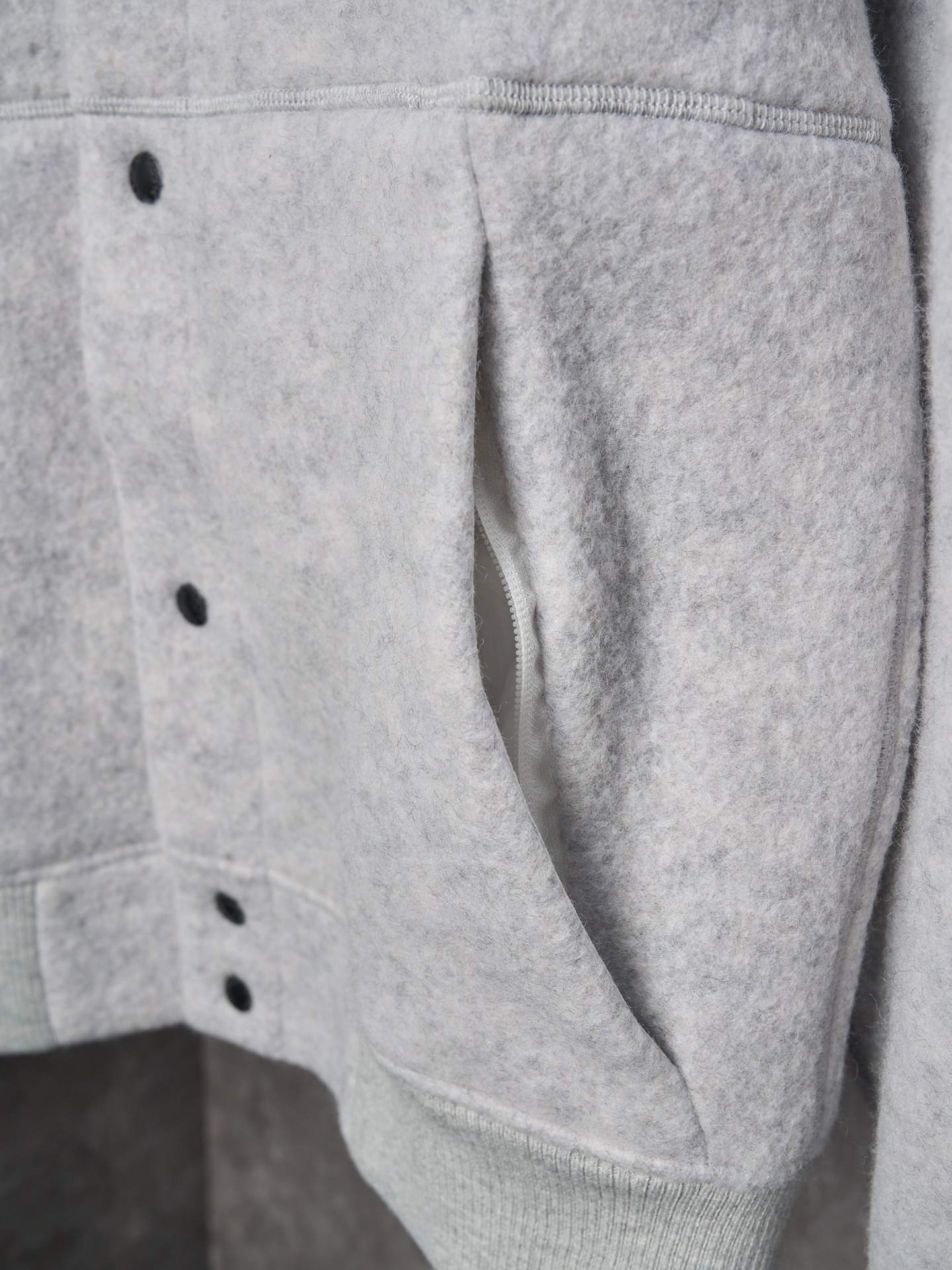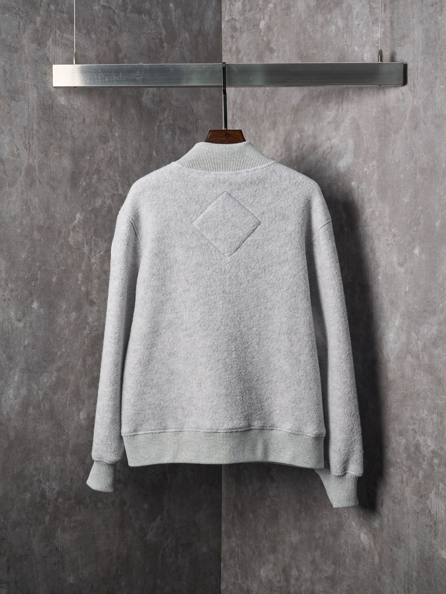 Details: Real-object photo of a durable and practical fleece-patched button-up wool blend jacket in dark and light gray, with a ribbed collar, cuffs, and hem, and a white circular patch on the left arm.