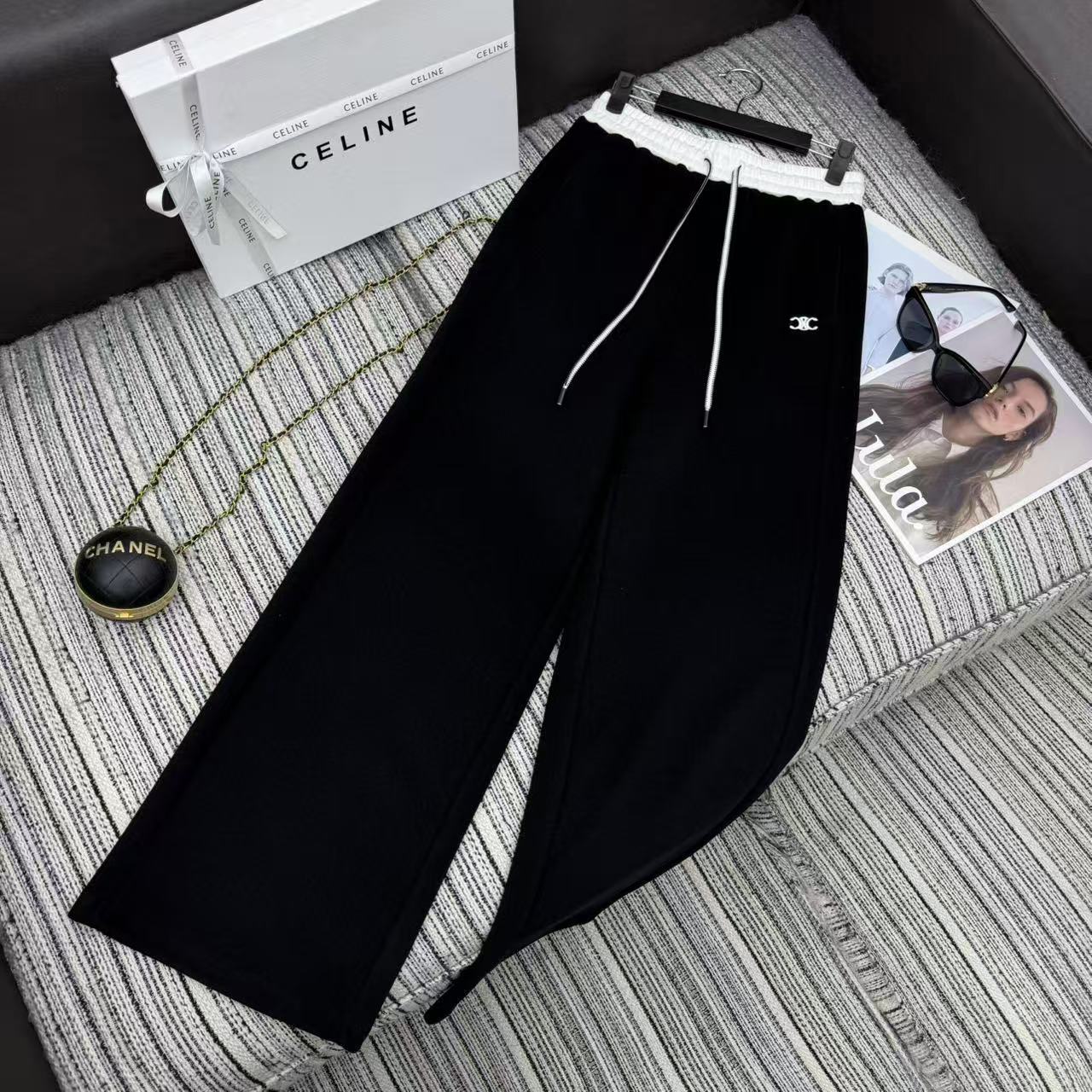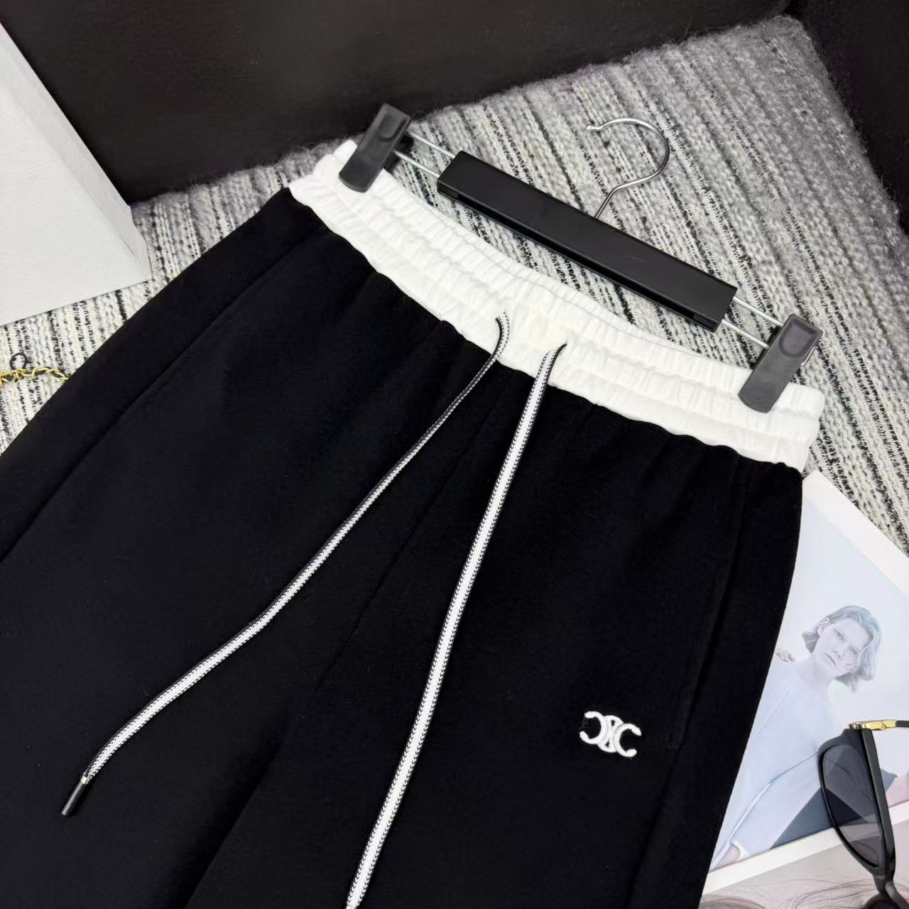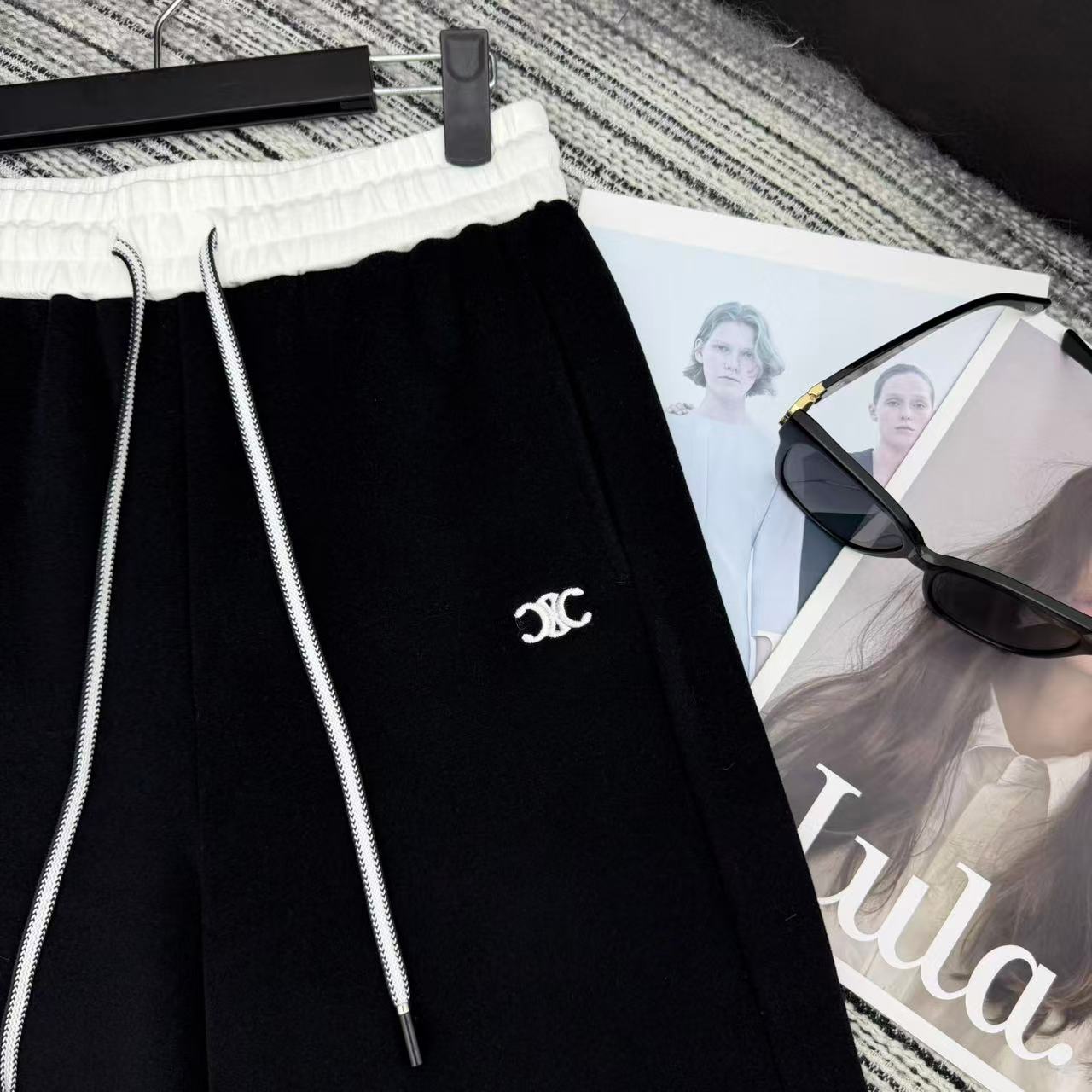 Details: New arch embroidery logo color-blocked elastic waist wide-leg pants in three colors, SML sizes.