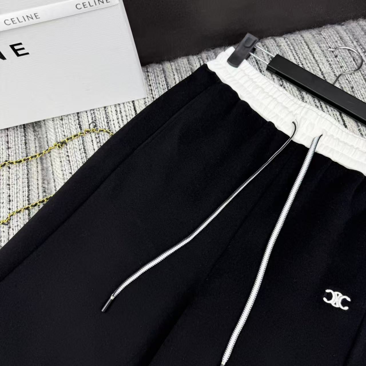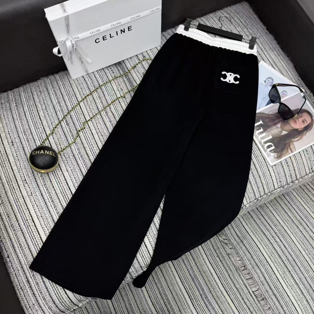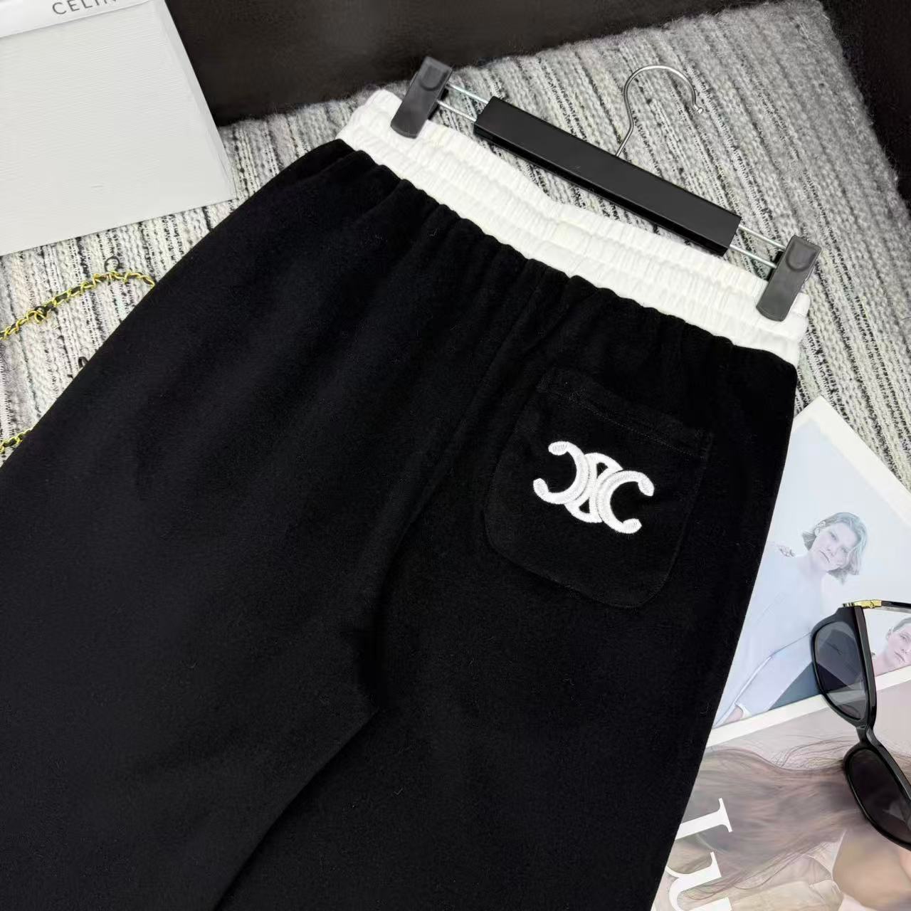 Details: New arch embroidery logo color-blocked elastic waist wide-leg pants in three colors, SML sizes.